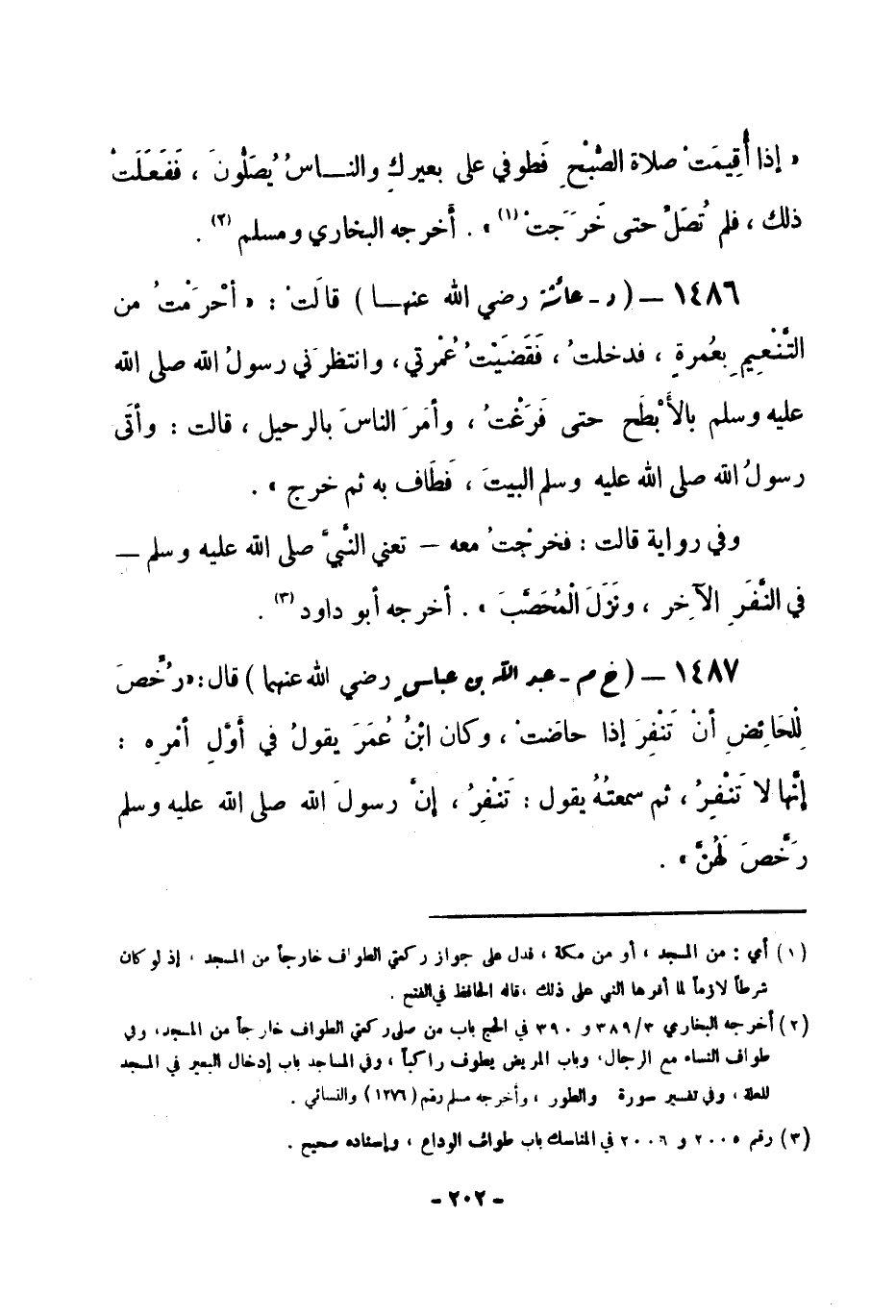 1487 - (خ م) عبد الله بن عباس -رضي الله عنهما- قال: «رُخَّصَ لِلْحَائِضِ أنْ تَنْفِرَ إذا حاضَتْ، وكان ابْنُ عُمَرَ يقولُ في أَوَّلِ أمْرِه: إنَّها لا تَنْفِرُ، ثم سمعتُهُ يقول: تَنْفِرُ، إنَّ رسولَ الله -صلى الله عليه وسلم- رَخَّصَ لَهُنَّ» . -[203]- وفي رواية قال: «أُمِرَ النَّاسُ أنْ يكُونَ آخِرُ عَهْدِهم بالبَيْتِ، إلا أنه خُفِّفَ عن المرأةِ الحائضِ» . أخرجه البخاري ومسلم. ولمسلم أيضا: قال طَاوُسٌ: «كُنْتُ مع ابن عباسٍ، إذا قال له زيدُ بنُ ثابتٍ: تُفْتي أنْ تَصْدُرَ الحائضُ قَبْلَ أنْ يَكُونَ آخِرُ عَهْدِها بالْبَيتِ؟ فقال له ابن عباسٍ: إمَّا لا، فَسَلْ فُلانَة الأْنصَاريَّةَ: هل أمَرَها بذلك رسولُ الله -صلى الله عليه وسلم-؟ فَرَجَعَ زيدٌ إلى ابنِ عبَّاسٍ يَضْحَكُ، وهو يقول: مَا أرَاكَ إلا وقد صَدَقْتَ» .