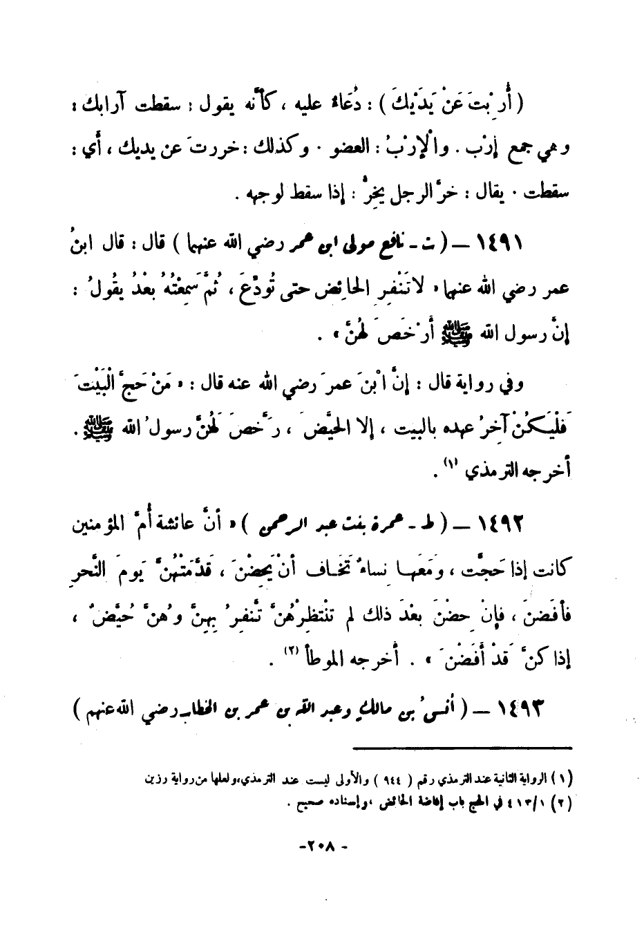 1491 - (ت) نافع مولى ابن عمر -رضي الله عنهما- قال: قال ابنُ عمر -رضي الله عنهما-، «لا تَنْفِر الحائض حتى تُودِّعُ، ثُمَّ سَمِعْتُهُ بعْدُ يقُولُ: إنَّ رسول الله -صلى الله عليه وسلم- أَرْخَصَ لهُنَّ» .