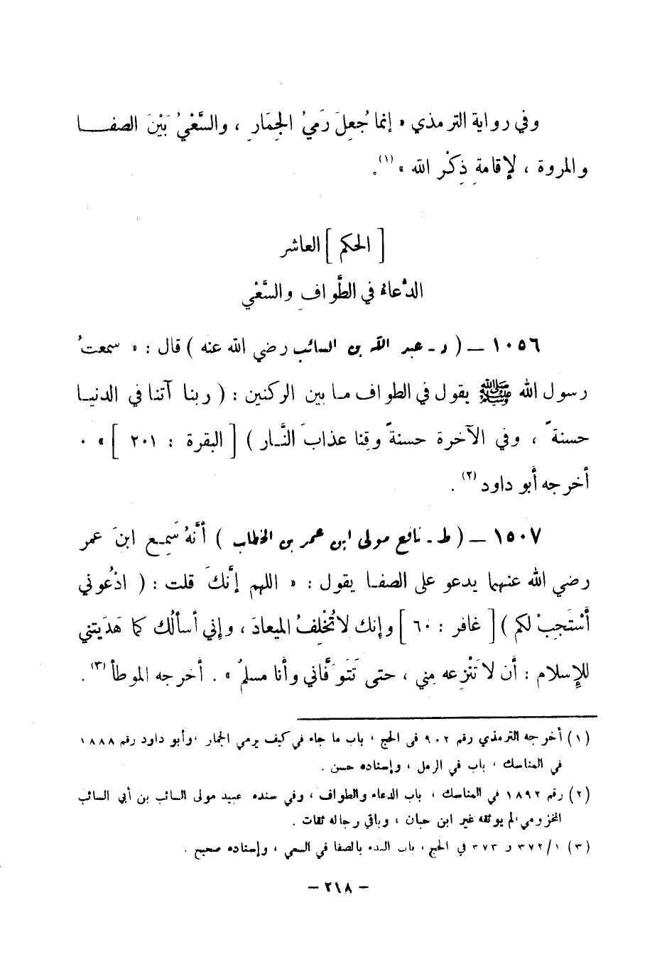 1506 - (د) عبد الله بن السائب - رضي الله عنه - قال: «سمعتُ رسول الله -صلى الله عليه وسلم- يقول في الطواف ما بين الركنين: {ربنا آتنا في الدنيا حسنةً وفي الآخرة حسنةً وقِنا عذابَ النَّار} [البقرة: 102] » . أخرجه أبو داود (¬1) .