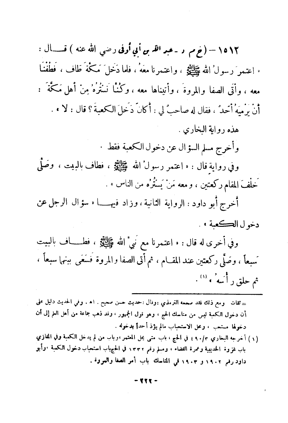 1512 - (خ م د) عبد الله بن أبي أوفى - رضي الله عنه - قال: «اعتمرَ رسولُ الله -صلى الله عليه وسلم-، واعتمرنا مَعَهُ، فلما دَخَلَ مَكَّةَ طَاف، فَطُفْنَا معه، وأتَى الصفا والمروةَ، وأتيناها معه، وكُنَّا نستُرُهُ مِنْ أهل مَكَّةَ: أنْ يَرْميهُ أحَدٌ، فقال له صاحبٌ لي: أكانَ دَخَلَ الكعبةَ؟ قال: لا» . هذه رواية البخاري.