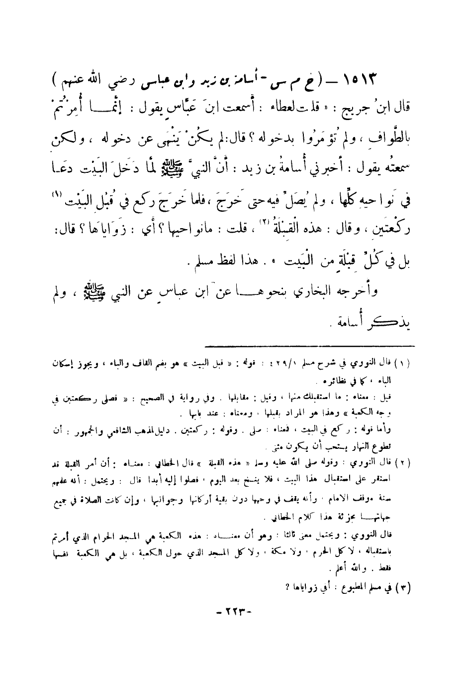 1513 - (خ م س) أسامة بن زيد وابن عباس -رضي الله عنهم- قال ابنُ جريج: «قلت لعطاء: أَسمعت ابنَ عَبَّاس يقول: إنَّما أُمِرتُمْ بالطَّوافِ، ولم تُؤمَروُا بدخوله؟ قال: لم يكُن يَنْهى عن دخوله، ولكن سمعتُه يقول: أخبرني أُسامةُ بن زيد: أنَّ النبيَّ -صلى الله عليه وسلم- لمَّا دخَلَ البَيْت دعَا في نَواحيه كلِّها، ولم يُصَلِّ فيه حتى خَرَجَ، فلما خَرَجَ ركع في قُبُل البَيْت (¬1) ركْعتَينِ، وقال: هذه الْقِبْلةُ (¬2) ، قلت: ما نواحيها؟ أي: زواياها (¬3) ؟ قال: بل في كُلِّ قِبْلَةٍ من الْبَيت» . هذا لفظ مسلم.