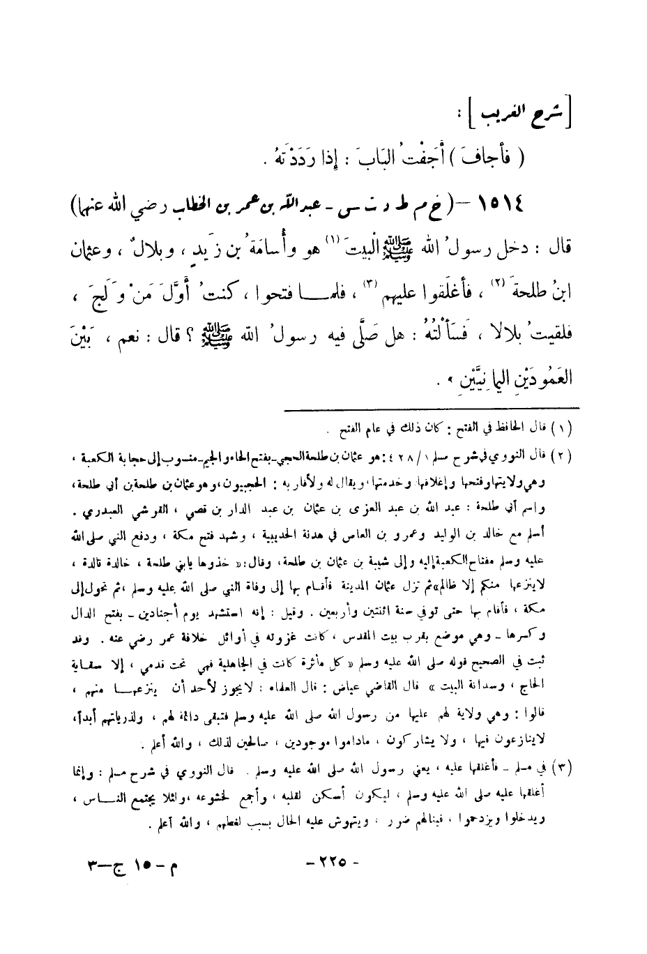 (¬2) قال النووي في " شرح مسلم " 1 / 428: هو عثمان بن طلحة الحجبي - بفتح الحاء والجيم - منسوب إلى حجابة الكعبة، وهي ولايتها وفتحها وإغلاقها وخدمتها، ويقال له ولأقاربه: الحجبيون، وهو عثمان بن طلحة بن أبي طلحة، واسم أبي طلحة: عبد الله بن عبد العزى بن عثمان بن عبد الدار بن قصي القرشي العبدري، أسلم مع خالد بن الوليد وعمرو بن العاص في هدنة الحديبية، وشهد فتح مكة، ودفع النبي صلى الله عليه وسلم مفتاح الكعبة إليه وإلى شيبة بن عثمان بن طلحة، وقال: " خذوها يا بني طلحة، خالدة تالدة، لا ينزعها منكم إلا ظالم " ثم نزل عثمان المدينة فأقام بها إلى وفاة النبي صلى الله عليه وسلم، ثم تحول إلى مكة، فأقام بها حتى توفي سنة اثنتين وأربعين، وقيل: إنه استشهد يوم أجنادين - بفتح الدال وكسرها - وهي موضع بقرب بيت المقدس، كانت غزوته في أوائل خلافة عمر بن الخطاب رضي الله عنه. وقد ثبت في الصحيح قوله صلى الله عليه وسلم: " كل مأثرة كانت في الجاهلية فهي تحت قدمي، إلا سقاية الحاج، وسدانة البيت " قال القاضي عياض: قال العلماء: لا يجوز لأحد أن ينزعها منهم، قالوا: وهي ولاية لهم عليها من رسول الله صلى الله عليه وسلم فتبقى دائمة لهم، ولذرياتهم أبداً، لا ينازعون فيها، ولا يشاركون، ما داموا موجودين، صالحين لذلك. والله أعلم.