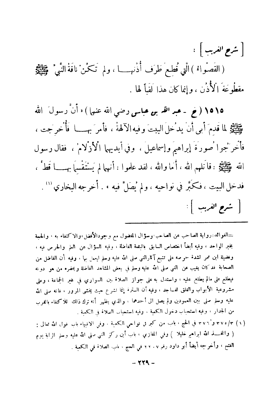 1515 - (خ) عبد الله بن عباس -رضي الله عنهما- «أنَّ رسولَ الله -صلى الله عليه وسلم- لما قَدِمَ أبى أنْ يدخُلَ البيتَ وفيه الآلهةُ، فأمرَ بها فَأُخْرِجَت، فأخْرَجُوا صُورَةَ إبراهيمَ وإسماعيل، وفي أيديهما الأزْلام، فقال رسول الله -صلى الله عليه وسلم-: قاتَلهم الله، أمَا والله،، لقد علموا: أنهما لم يَسْتَقْسِمَا بها قَطُّ، فدخل البيت، فكبَّر في نواحيه، ولم يُصَلِّ فيه» . أخرجه البخاري (¬1) .
