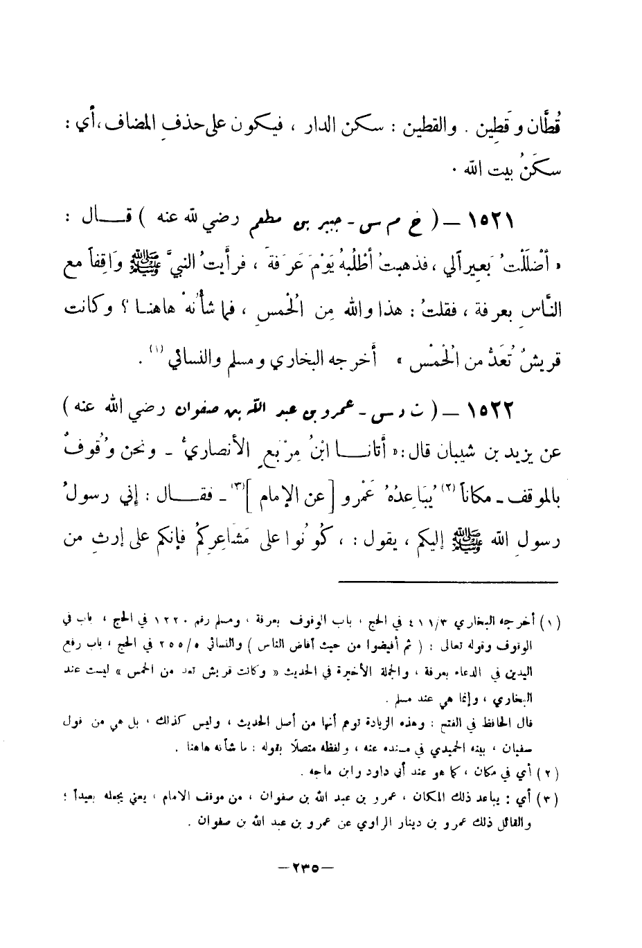 1521 - (خ م س) جبير بن مطعم -رضي الله عنه-: قال: «أضْلَلْتُ بَعِيراً لي، فذهبتُ أطْلُبهُ يَوْمَ عَرَفة، فرأيتُ النبيَّ -صلى الله عليه وسلم- وَاقِفاً مع النَّاس بِعرفة، فقلتُ: هذا والله مِن الْحُمسِ، فما شأُنُه ها هنا؟ وكانت قريشُ تُعَدُّ من الْحُمْس» . أخرجه البخاري ومسلم والنسائي (¬1) .
