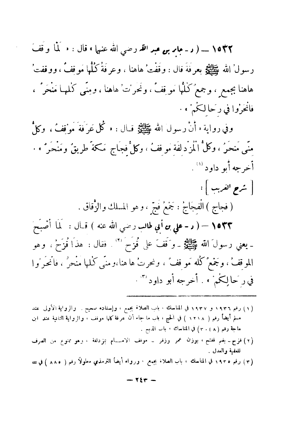 (¬1) رقم (1936) و (1937) في المناسك، باب الصلاة بجمع، وإسناده صحيح. والرواية الأولى عند مسلم أيضاً رقم (1218) في الحج، باب ما جاء أن عرفة كلها موقف، والرواية الثانية عند ابن ماجة رقم (3048) في المناسك، باب الذبح.