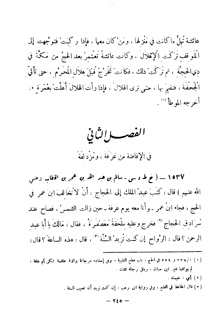 (¬3) أخرجه البخاري 3 / 408 و 409 في الحج، باب التهجير بالرواح يوم عرفة، وباب قصر الخطبة -[247]- بعرفة. والموطأ 1 / 399 في الحج، باب الصلاة في البيت وقصر الصلاة وتعجيل الخطبة بعرفة، وأبو داود رقم (1914) في المناسك، باب الرواح إلى عرفة، والنسائي 5 / 252 في الحج، باب الرواح يوم عرفة، وباب قصر الخطبة بعرفة، وأخرجه أيضاً ابن ماجة رقم (3009) في المناسك، باب المنزل بعرفة. قال الحافظ في " الفتح " 3 / 409: قال ابن بطال: وفي هذا الحديث الغسل للوقوف بعرفة، لقول الحجاج لعبد الله: أنظرني، فانتظره، وأهل العلم يستحبونه. اهـ. ويحتمل أن يكون ابن عمر إنما انتظره لحمله على أن اغتساله عن ضرورة. نعم روى مالك في " الموطأ " عن نافع أن ابن عمر كان يغتسل لوقوفه عشية عرفة، قال: وفيه أن إقامة الحج إلى الخلفاء، وأن الأمير يعمل في الدين بقول أهل العلم، ويصير إلى رأيهم، وفيه مداخلة العلماء بالسلاطين وأنه لا نقيصة عليهم في ذلك. وفيه فتوى التلميذ بحضرة معلمه عند السلطان وغيره، وفيه الفهم بالإشارة، وفيه طلب العلو في العلم لتشوف الحجاج إلى سماع ما أخبره به سالم عن أبيه ابن عمر، ولم ينكر ذلك ابن عمر. وفيه تعليم الفاجر السنن لمنفعة الناس، وفيه احتمال المفسدة الخفيفة لتحصيل المصلحة الكبيرة، يؤخذ ذلك من مضي ابن عمر إلى الحجاج وتعليمه، وفيه الحرص على نشر العلم لانتفاع الناس به، وفيه صحة الصلاة خلف الفاسق، وأن التوجه إلى المسجد الذي بعرفة حين تزول الشمس للجمع بين الظهر والعصر في أول وقت الظهر سنة، ولا يضر التأخر بقدر ما يشتغل به المرء من متعلقات الصلاة كالغسل ونحوه.