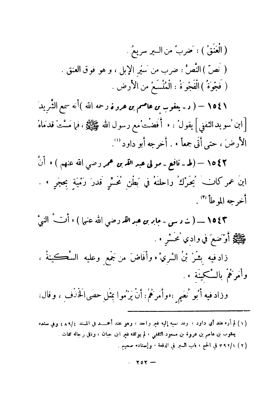 1542 - (ط) نافع مولى عبد الله بن عمر -رضي الله عنهم- «أنَّ ابنَ عمر كان يُحَرِّكُ راحلتَهُ في بَطْنِ مُحَسِّرٍ قَدرَ رَمْيَةٍ بِحجَرٍ» . أخرجه الموطأ (¬1) .