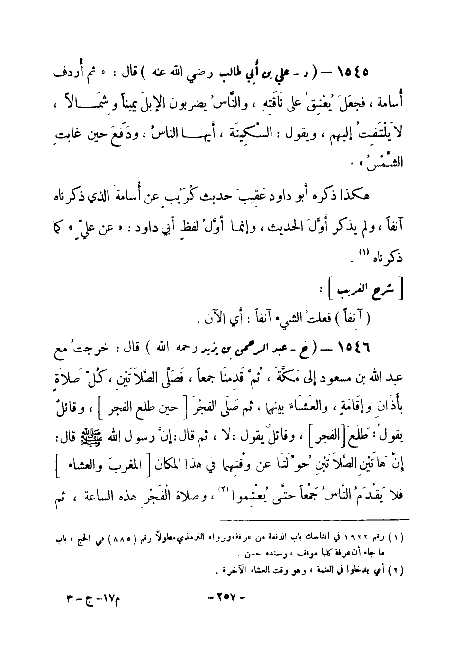 (¬1) رقم (1922) في المناسك، باب الدفعة من عرفة، ورواه الترمذي مطولاً رقم (885) في الحج، باب ما جاء أن عرفة كلها موقف، وسنده حسن.