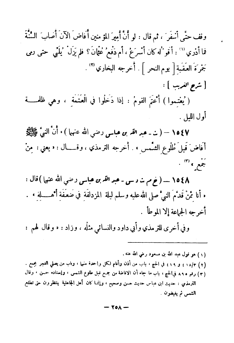1548 - (خ م ت د س) عبد الله بن عباس -رضي الله عنهما- قال: «أنا ممَّنْ قَدَّمَ النبيُّ -صلى الله عليه وسلم- ليلة المزدلفَةِ في ضَعفَةِ أهْلِهِ» . أخرجه الجماعة إلا الموطأ.