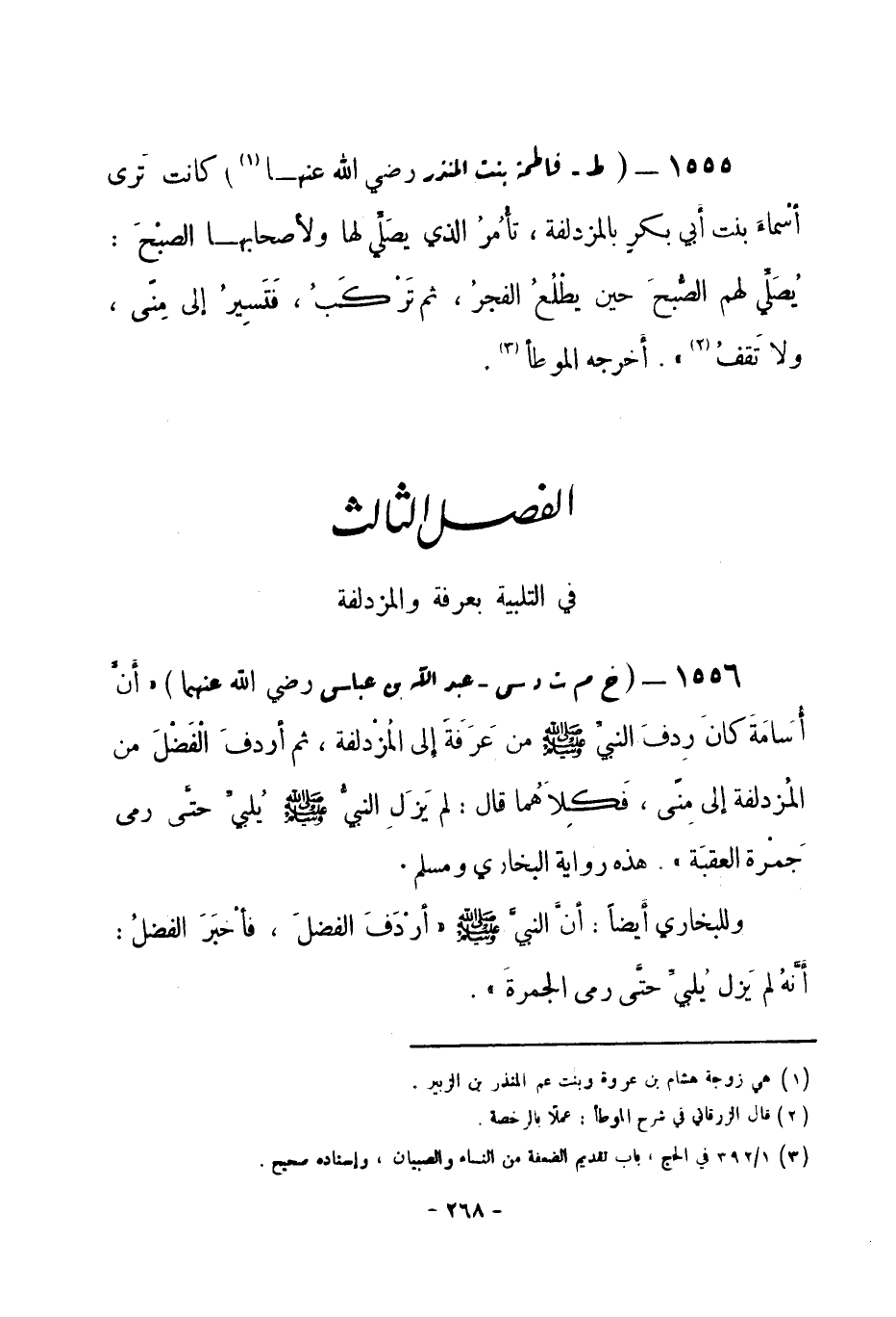 1555 - (ط) فاطمة بنت المنذر -رضي الله عنها (¬1) - كانت تَرى أسْماء بنت أبي بكرٍ بالمزدلفة، تأمُرُ الذي يصَلِّي لها ولأصحابها الصبْحَ: «يُصَلِّي لهم الصُّبحَ حين يطْلُعَ الفجرُ، ثم تَرْكَبُ، فَتَسيِرُ إلى مِنى، ولا تقفُ (¬2) » . أخرجه الموطأ (¬3) .