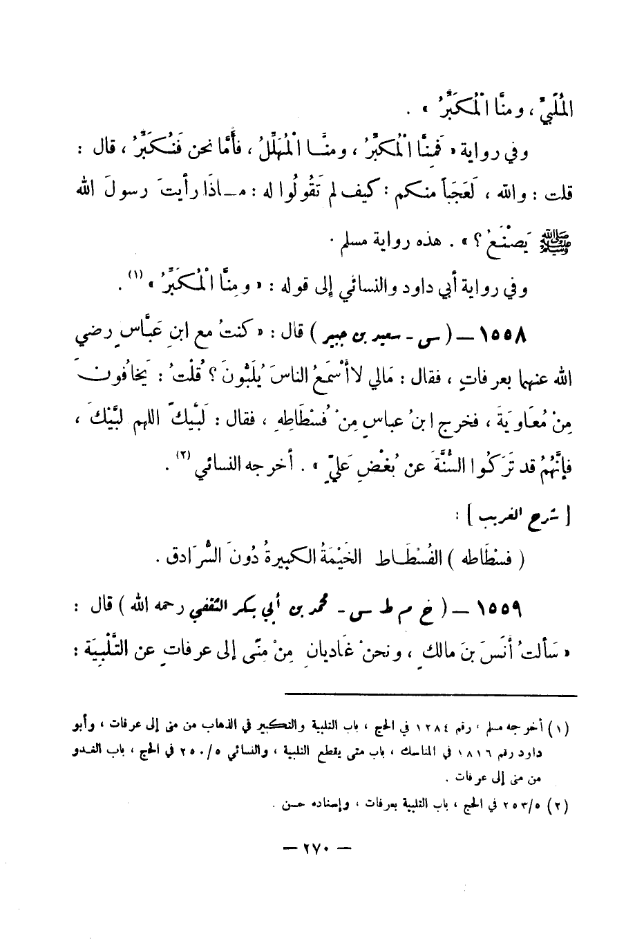 1559 - (خ م ط س) محمد بن أبي بكر الثقفي -رحمه الله- قال: «سألتُ أنَسَ بنَ مالكٍ، ونحن غاديانِ مِن منَى إلى عرفاتٍ عن التلبيَة: -[271]- كيف كنتم تَصنْعُون مع النبي -صلى الله عليه وسلم-؟ قال: كان يُلبِّي المُلبيِّ، فَلا يُنكرُ عليه. ويُكَبِّرُ المُكَبِّرُ فلا يُنْكَرُ عليه» .