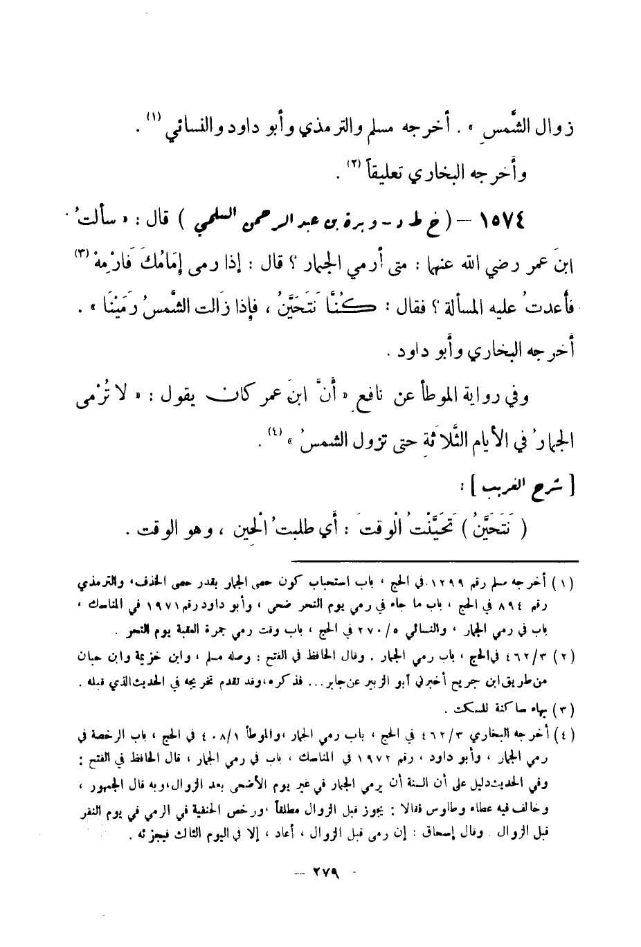 1574 - (خ ط د) وبرة بن عبد الرحمن السلمي قال: «سألتُ ابنَ عمر -رضي الله عنهما-: متى أرمي الجمار؟ قال: إذا رمى إمَامُكَ فَارْمِهْ (¬1) فأَعدتُ عليه المسألة؟ فقال: كُنَّا نَتَحَيَّنُ، فإذا زَالت الشَّمسُ رَمَيْنَا» . أخرجه البخاري وأبو داود.