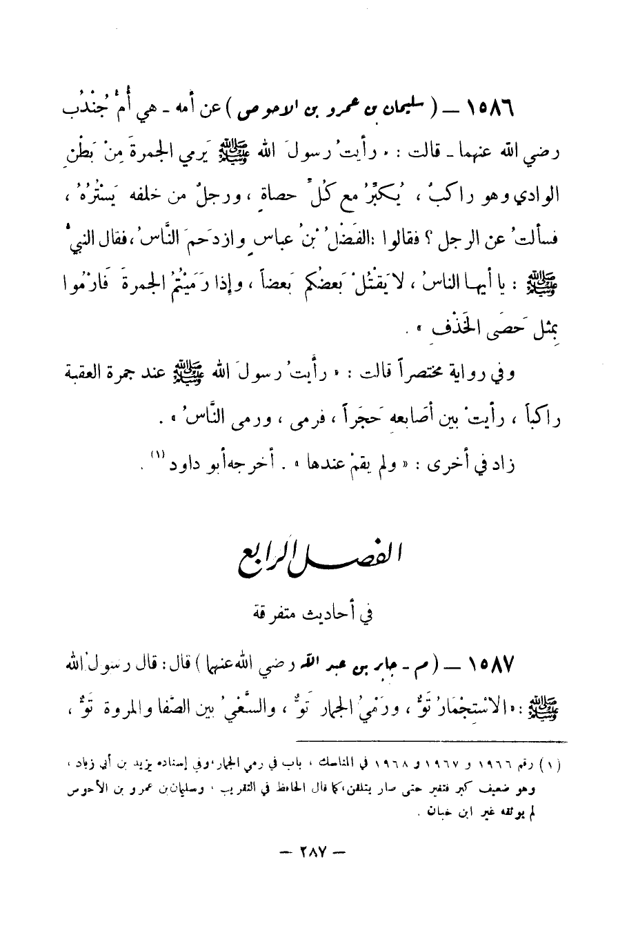 1586 - (د) سليمان بن عمرو بن الأحوص عن أمه - هي أُمُّ جُنْدُب -رضي الله عنهما- قالت: «رأيتُ رسولَ الله -صلى الله عليه وسلم- يَرمي الجمرةَ مِنْ بَطْنِ الوادي وهو راكبٌ، يُكبِّرُ مع كُلِّ حصاةٍ، ورجلٌ من خلفه يَسْتُرهُ، فسألتُ عن الرجل؟ فقالوا: الفَضْلُ بْنُ عباس وازدحَمَ النَّاسُ، فقال النبيُّ -صلى الله عليه وسلم-: يا أيها الناسُ، لا يَقْتُلْ بَعضُكم بَعضاً، وإذا رَمَيْتُمُ الجمرة فَارْمُوا بمثل حصى الخذف» .