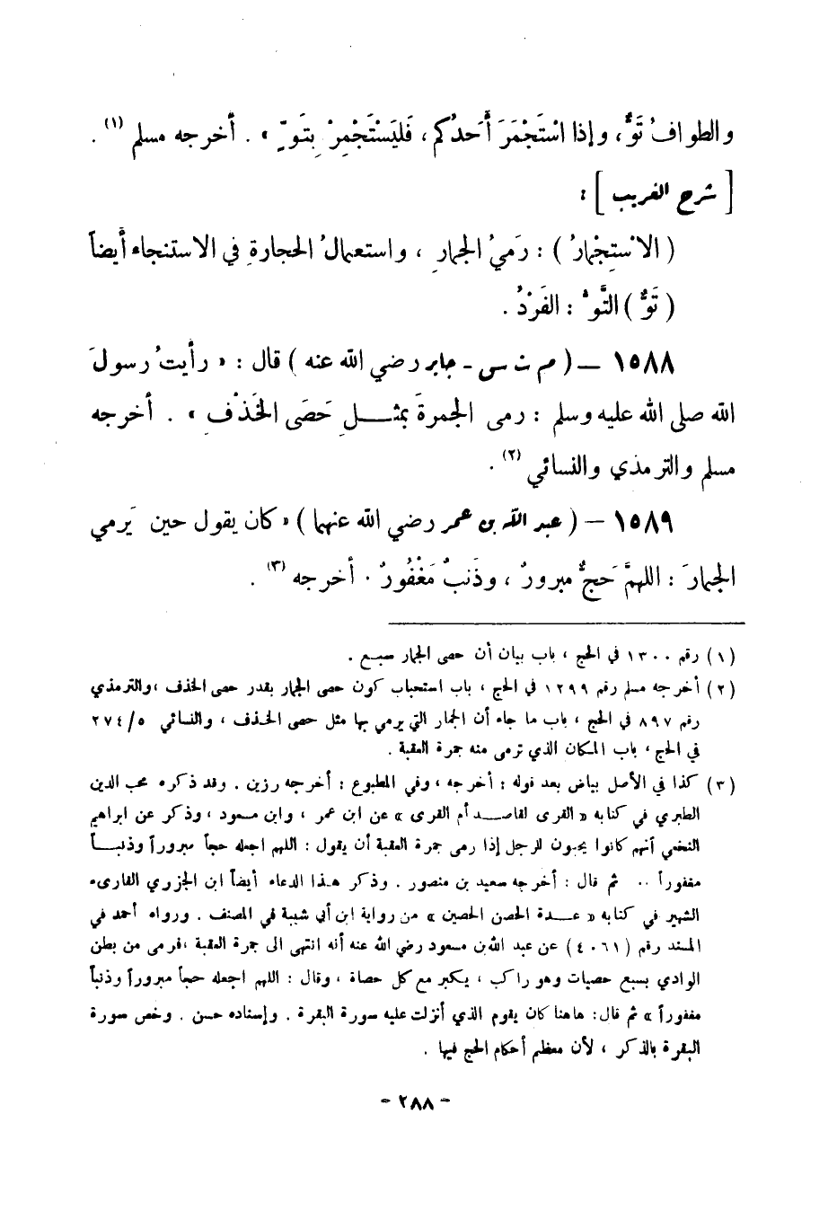 1588 - (م ت س) جابر - رضي الله عنه - قال: «رأيتُ رسولَ الله -صلى الله عليه وسلم-: رمى الجمرةَ بمثلِ حَصَى الخَذْف» .أخرجه مسلم والترمذي والنسائي (¬1) .