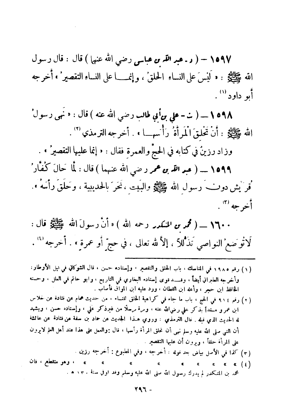 1597 - (د) عبد الله بن عباس -رضي الله عنهما- قال: قال رسول الله -صلى الله عليه وسلم-: «لَيْسَ على النساءِ الحلقُ، وإنما على النساءِ التقصيرُ» . أخرجه أبو داود (¬1) .