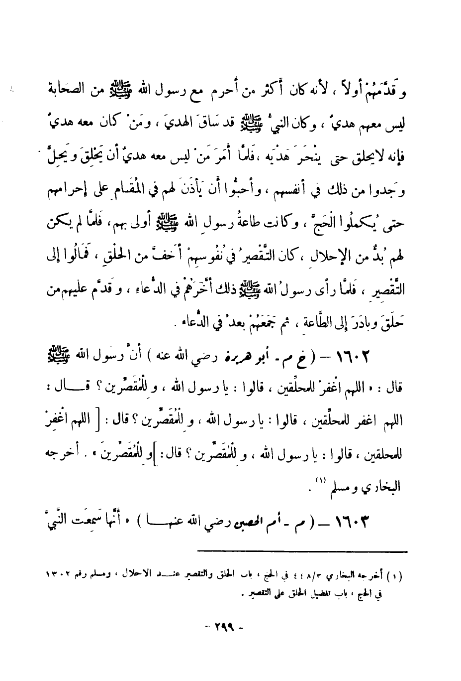 1602 - (خ م) أبو هريرة - رضي الله عنه - أنَّ رسولَ الله -صلى الله عليه وسلم- قال: «اللهم اغْفرْ للمحلِّقين، قالوا: يارسول الله، والْمُقَصِّرين؟ قال: اللهم اغفر للمحلِّقين، قالوا: يا رسول الله، ولِلْمُقَصِّرين؟ قال: [اللهم اغْفِر للمحلقين، قالوا: يا رسول الله، وللْمُقَصِّرين؟ قال:] ولِلْمُقَصرينَ» . أخرجه البخاري ومسلم (¬1) .