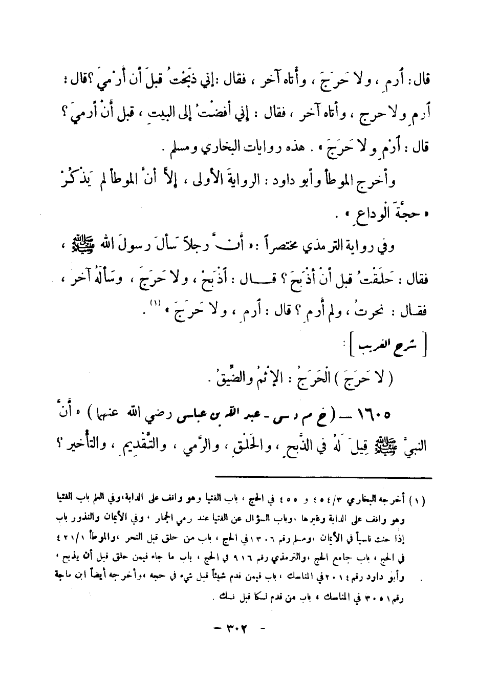 1605 - (خ م د س) عبد الله بن عباس -رضي الله عنهما- «أنَّ النبي -صلى الله عليه وسلم- قِيلَ لَهُ في الذبحِ، والحَلْقِ، والرَّمي، والتَّقْدِيم، والتأْخير؟ -[303]- فقال: لا حَرجَ» . هذه رواية البخاري ومسلم.