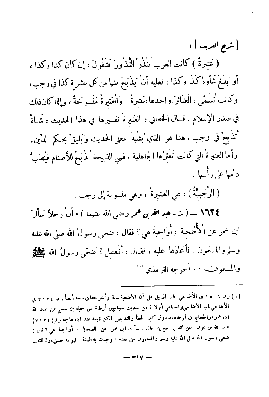 1624 - (ت) عبد الله بن عمر -رضي الله عنهما- أن رجلاً سَألَ ابنَ عمر عن الأُضْحِيةِ: أوَاجبةٌ هي؟ فقال: «ضَحى رسولُ الله -صلى الله عليه وسلم- والمسلمون، فَأعَدَها عليه، فقال: أتَعقِل؟ ضَحَّى رسولُ الله -صلى الله عليه وسلم- والمسلمون» . أخرجه الترمذي (¬1) .