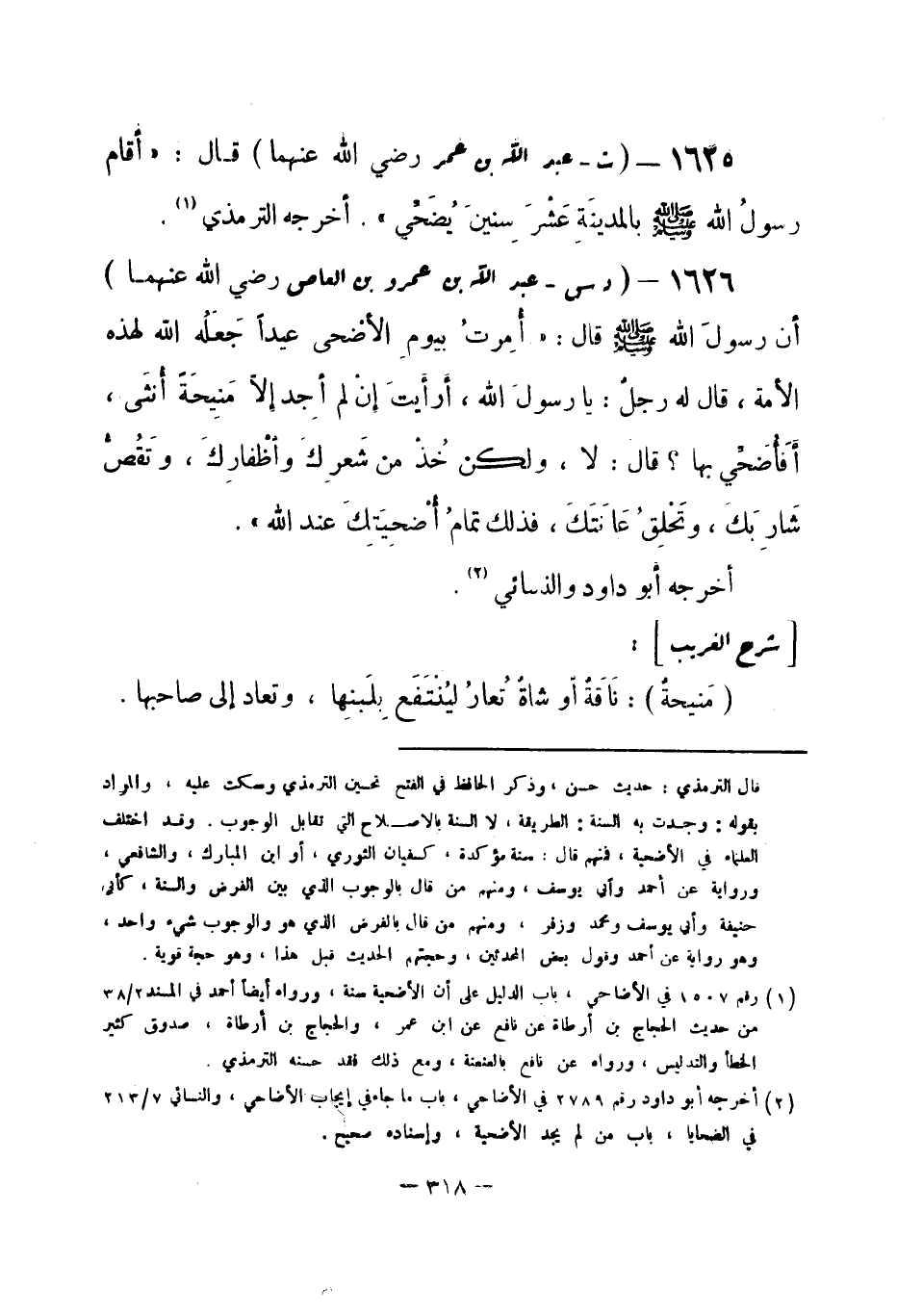 (¬1) رقم (1507) في الأضاحي، باب الدليل على أن الأضحية سنة، ورواه أيضاً أحمد في المسند 2 / 38 من حديث الحجاج بن أرطأة عن نافع عن ابن عمر، والحجاج بن أرطأة، صدوق كثير الخطأ والتدليس، ورواه عن نافع بالعنعنة، ومع ذلك فقد حسنه الترمذي.