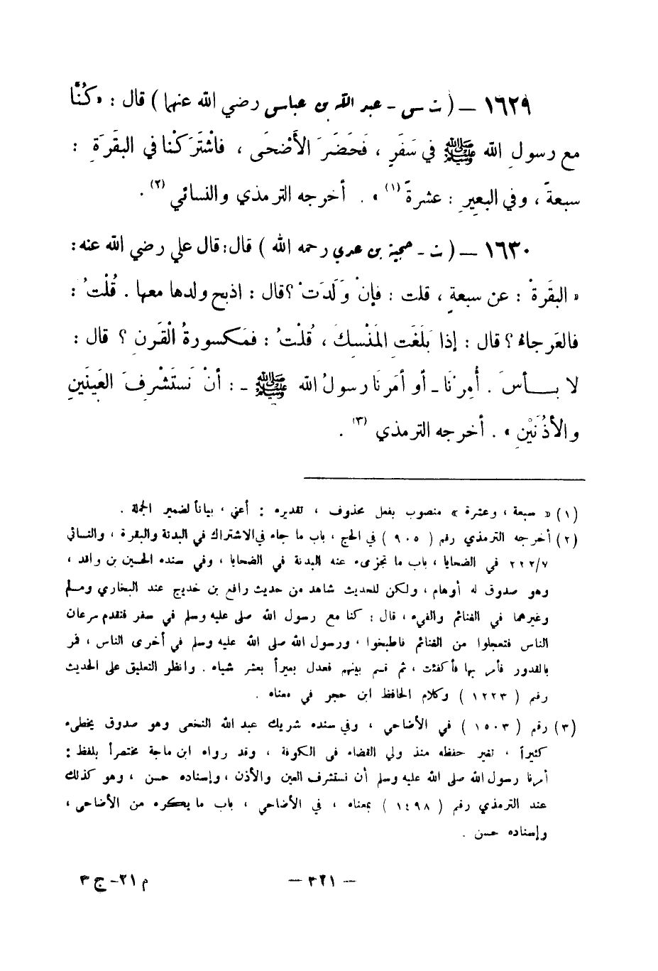 1629 - (ت س) عبد الله بن عباس -رضي الله عنهما- قال: «كُنَّا مع رسولِ الله -صلى الله عليه وسلم- في سَفَرٍ، فَحَضَرَ الأَضْحَى، فاشْتَرَكْنا في البقَرَةِ: سبعةً، وفي البعِيرِ: عشرة (¬1) » . أخرجه الترمذي والنسائي (¬2) .