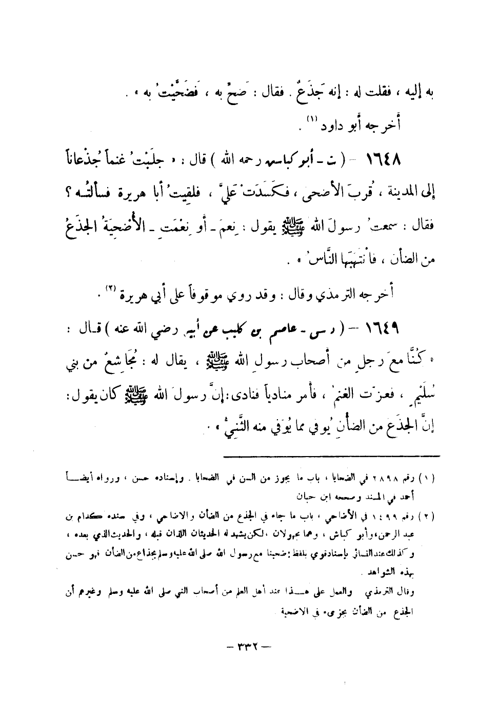 1648 - (ت) أبو كباس -رحمه الله- قال: «جلَبْتُ غنماً جُذْعاناً إلى المدينة، قُربَ الأضحى، فكَسَدَتْ عليَّ، فلقِيتُ أبا هريرة فسألتُه؟ فقال: سمعتُ رسولَ الله -صلى الله عليه وسلم- يقول: نِعمَ - أو نِعْمَتِ - الأُضْحِيةُ الجذَعُ من الضأن، فانْتهبَها النَّاس» .