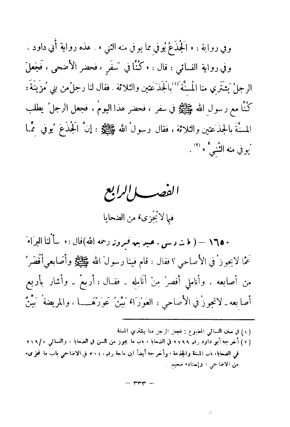 (¬1) أخرجه الموطأ 2 / 482 في الضحايا، باب ما ينهى عنه من الضحايا، والترمذي رقم (1497) في الأضاحي، باب ما لا يجوز من الأضاحي، وأبو داود رقم (2802) في الضحايا، باب ما يكره من الضحايا، والنسائي 7 /214 و 215 في الضحايا، باب ما نهي عنه من الأضاحي العوراء، وباب العرجاء، وباب العجفاء، وإسناده صحيح.