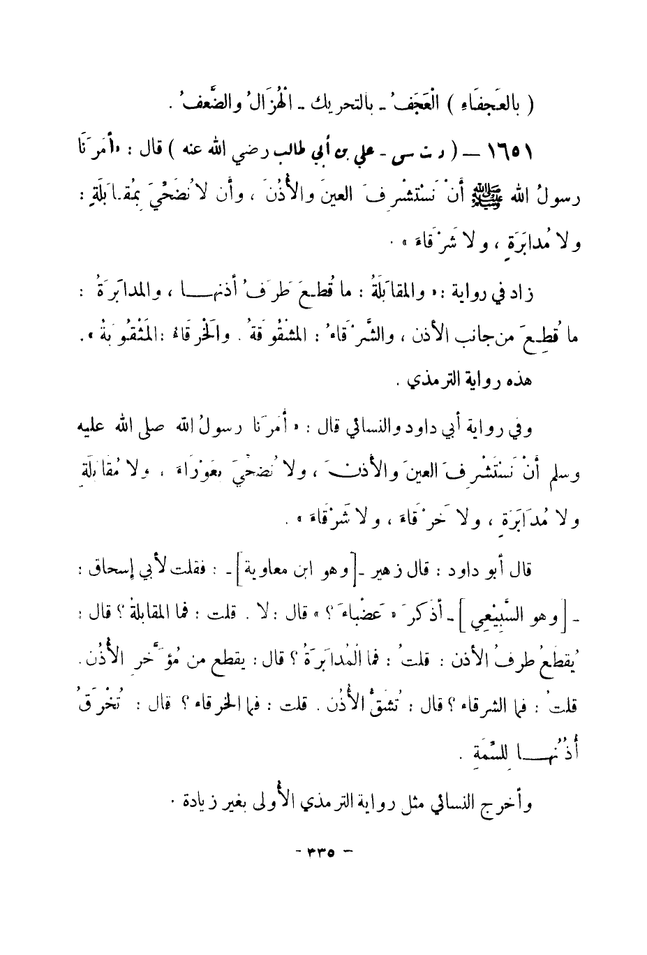 1651 - (د ت س) علي بن أبي طالب - رضي الله عنه - قال: «أمَرَنَا رسولُ الله -صلى الله عليه وسلم- أنْ نَسْتشْرِفَ العينَ والأُذْنَ، وأن لا نُضَحِّيَ بمُقابَلَةٍ: ولا مُدابَرَةٍ، ولا شَرْقَاءَ» .