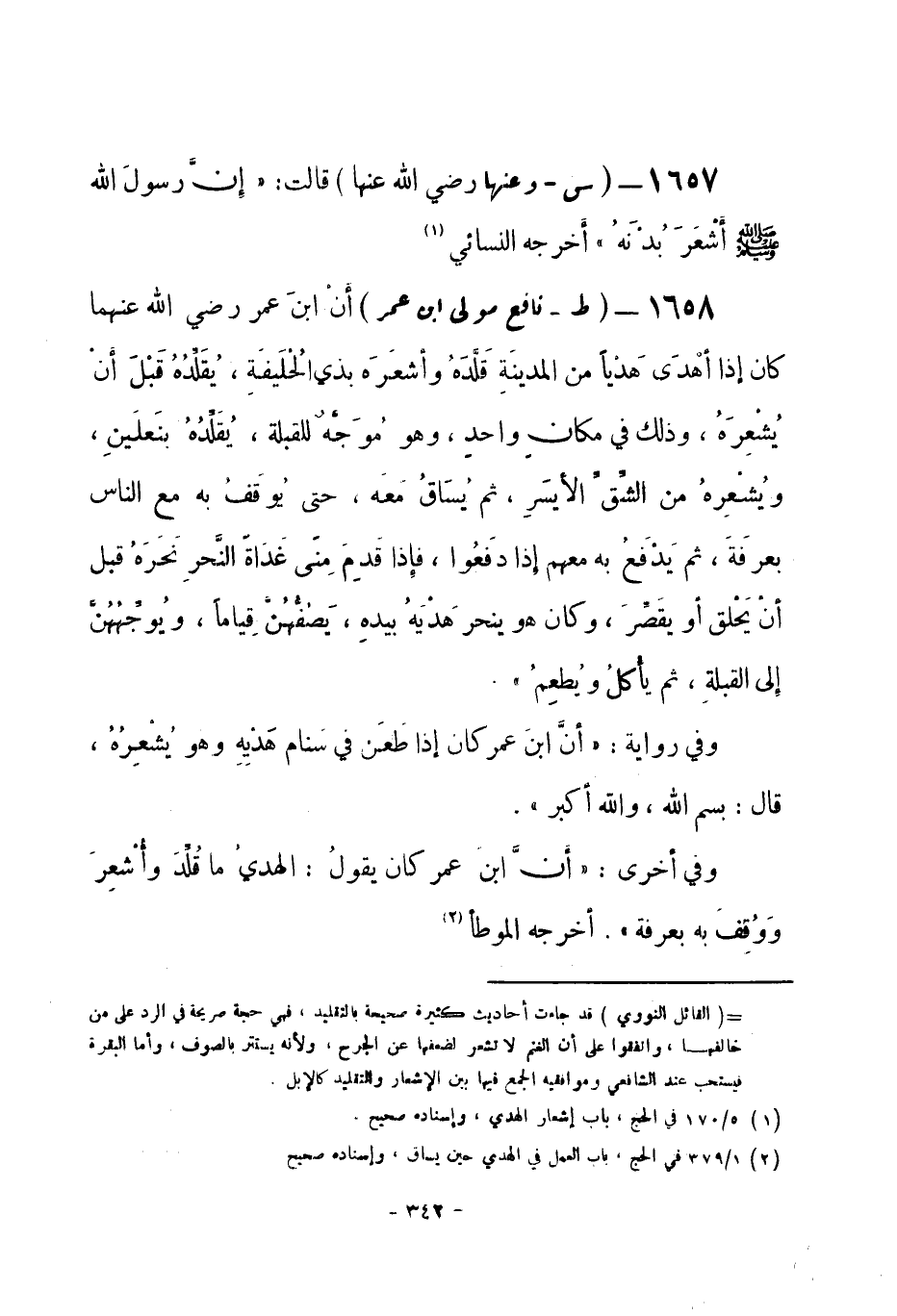 1658 - (ط) نافع مولى ابن عمر أنْ ابنَ عمر -رضي الله عنهما- «كان إذا أهْدَى هَدْياً من المدينَةِ قَلَّدَةُ وأشعَرَه بذي الْحُلَيفَةِ، يُقَلِّدُهُ قَبْلَ أنْ يُشْعِرهُ، وذلك في مكان واحدٍ، وهو مُوَجهٌ للقبلة، يُقَلِّدُهُ بنَعلَينِ، ويُشْعِرهُ من الشِّقِّ الأيسَرِ، ثم يُسَاقُ مَعَه، حتى يُوقَفُ به مع الناس بعرفَةَ، ثم يَدْفَعُ به معهم إذا دفَعُوا، فإذا قَدِمَ مِنَى غَداةَ النَّحرِ نَحَرَهُ قبل أنْ يَحْلق أو يقَصِّرَ، وكان هو ينحر هَدْيَهُ بيدهِ، يَصفُّهُنَّ قِياماً، ويُوجِّهُهُنَّ إلى القبلةِ، ثم يأكلُ ويُطعِمُ» .