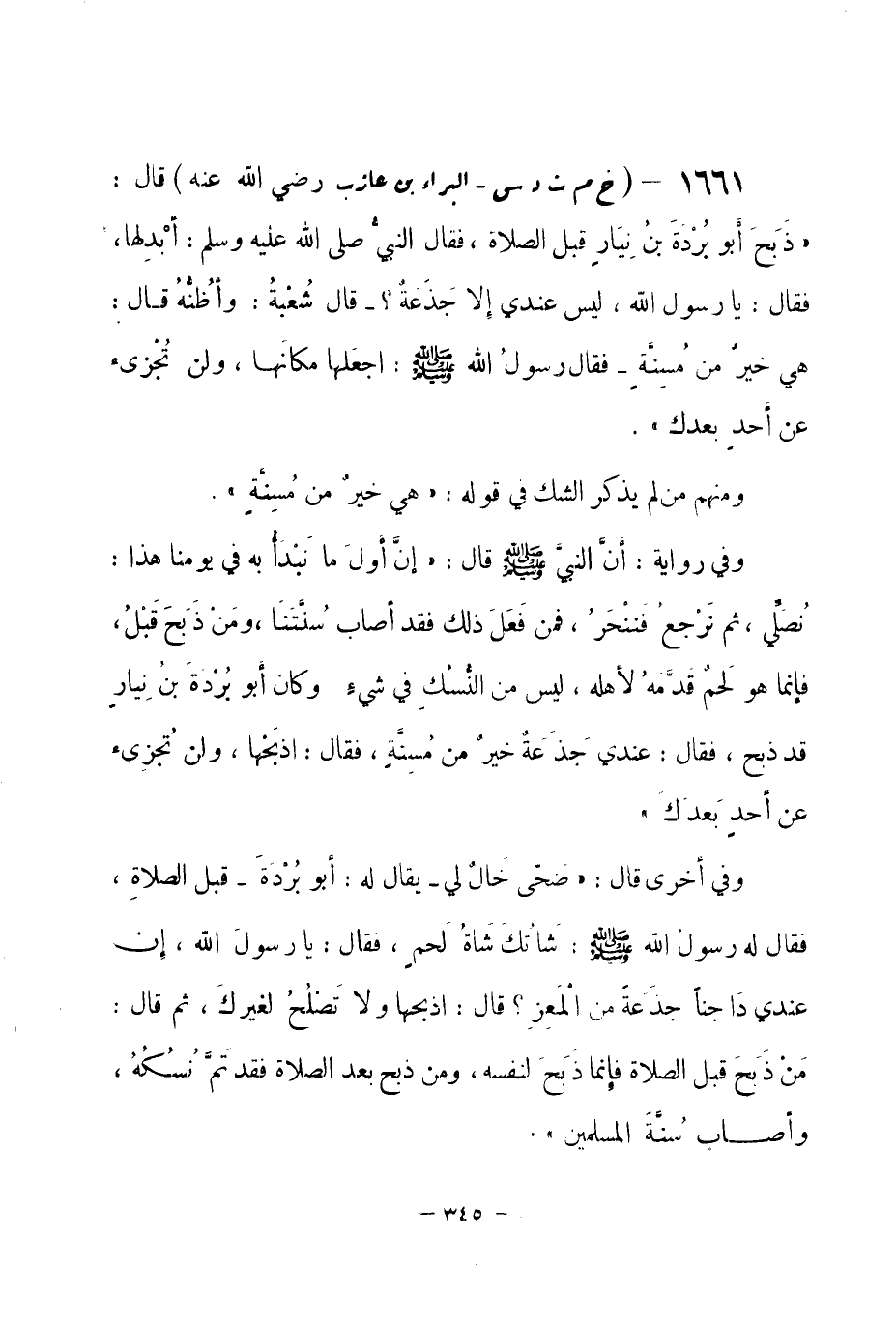 1661 - (خ م ت د س) البراء بن عازب - رضي الله عنه - قال: «ذَبح أبو بُرْدَةَ بنُ نِيَارٍ قبل الصلاة، فقال النبيُّ -صلى الله عليه وسلم-: أبْدلها، فقال: يا رسول الله، ليس عندي إلا جَذَعةٌ؟ - قال شُعْبةُ: وأظُنُّهُ قال: هي خيرٌ من مُسِنَّةٍ - فقال رسولُ الله -صلى الله عليه وسلم-: اجعَلها مكانها، ولن تُجْزىء عن أحدٍ بعدك» .