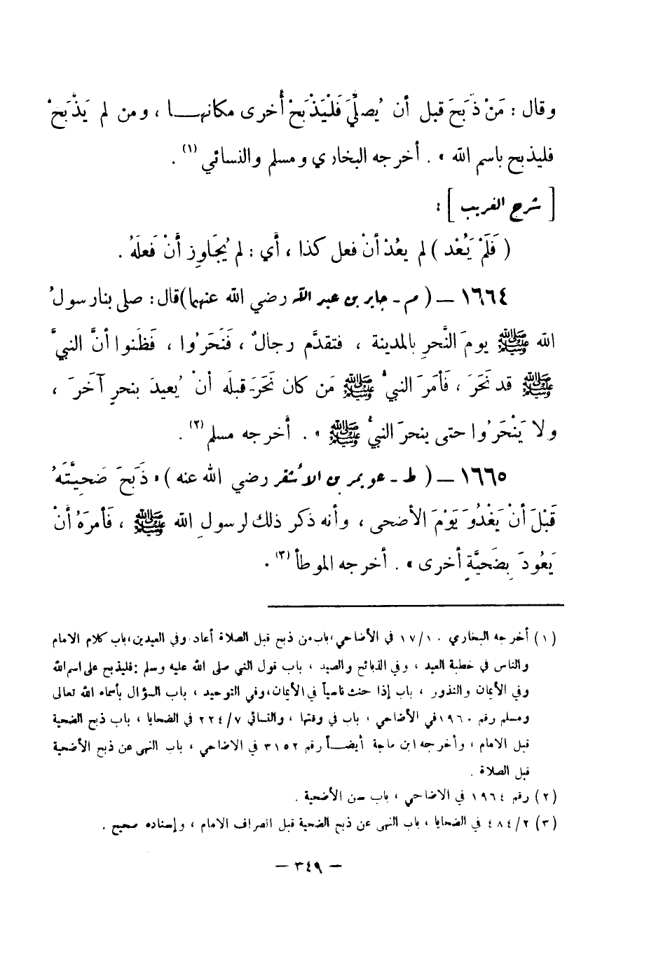 1664 - (م) جابر بن عبد الله -رضي الله عنهما- قال: «صلى بنا رسولُ الله -صلى الله عليه وسلم- يومَ النَّحرِ بالمدينة، فتقدَّم رجالٌ، فَنَحَرُوا، فَظَنوا أنَّ النبيَّ -صلى الله عليه وسلم- قد نَحَرَ، فَأمَرَ النبيُّ -صلى الله عليه وسلم- مَن كان نَحَرَ قبلَه أنْ يُعيدَ بنحرٍ آخَرَ، ولا يَنْحَرُوا حتى ينحرَ النبيُّ -صلى الله عليه وسلم-» . أخرجه مسلم (¬1) .