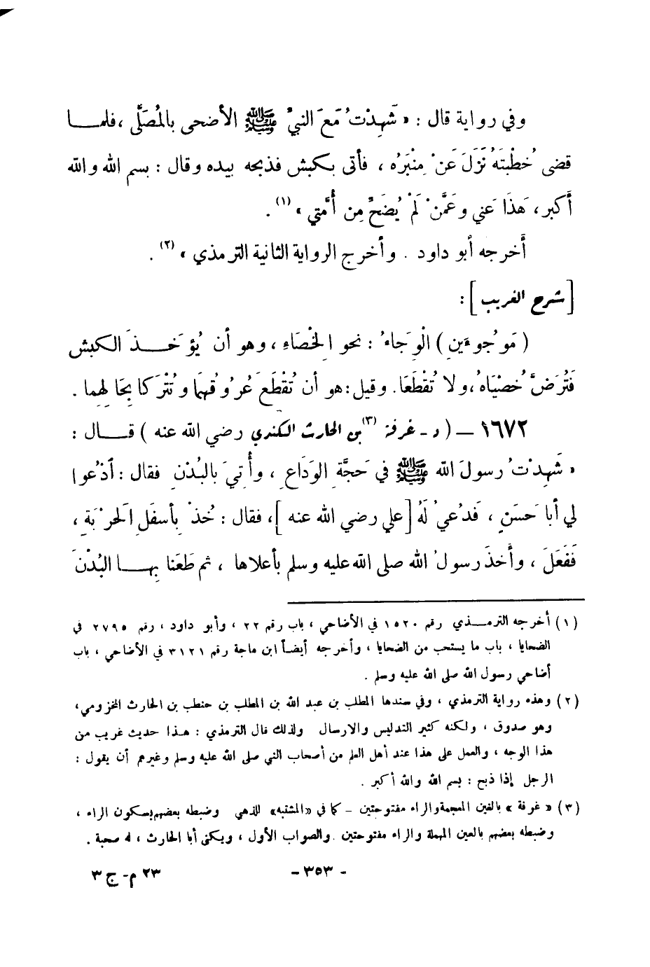 1672 - (د) غرفة (¬1) بن الحارث الكندي - رضي الله عنه - قال: «شَهِدْتُ رسولَ الله -صلى الله عليه وسلم- في حَجَّةِ الوَدَاعِ، وأُتِيَ بالبُدنِ فقال: ادْعُوا لي أبا حسَنٍ، فَدُعيُ لَهُ [علي -رضي الله عنه-] ، فقال: خُذْ بِأسفَل الحَرْبَةِ، فَفَعَلَ، وأخذ رسولُ الله -صلى الله عليه وسلم- بأعلاها، ثم طَعَنا بِها البُدْنَ -[354]- وَهِيَ مَعقُولةُ الْيدِ اليسرى، قائمةٌ على ما بقيَ مِنْ قوائمها، وذلك يومَ النَّحرِ بِمنَى، فَلمَّا فرغَ ركبَ بَغْلتَهُ وأردفَ عليّاً» .