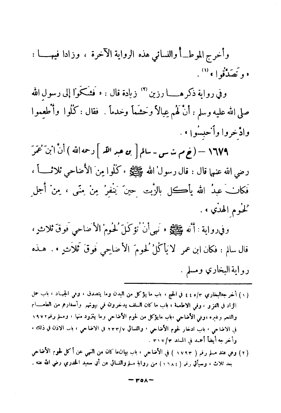 1679 - (خ م ت س) سالم [بن عبد الله]-رحمه الله- أنَّ ابْنَ عُمَرَ -رضي الله عنهما- قال: قال رسولُ الله -صلى الله عليه وسلم- «كُلُوا مِنَ الأَضاحي ثلاثاً، فَكانَ عبدُ الله يأكل بالزَّيت حِينَ يَنْفِرُ مِنْ مِنَى، مِنْ أجلِ لُحُومِ الهدْي» .