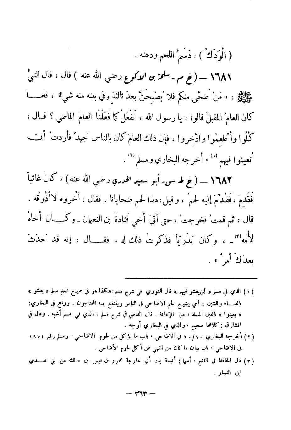 (¬2) أخرجه البخاري 10 /20 في الأضاحي، باب ما يؤكل من لحوم الأضاحي، ومسلم رقم (1974) في الأضاحي، باب بيان ما كان من النهي عن أكل لحوم الأضاحي.