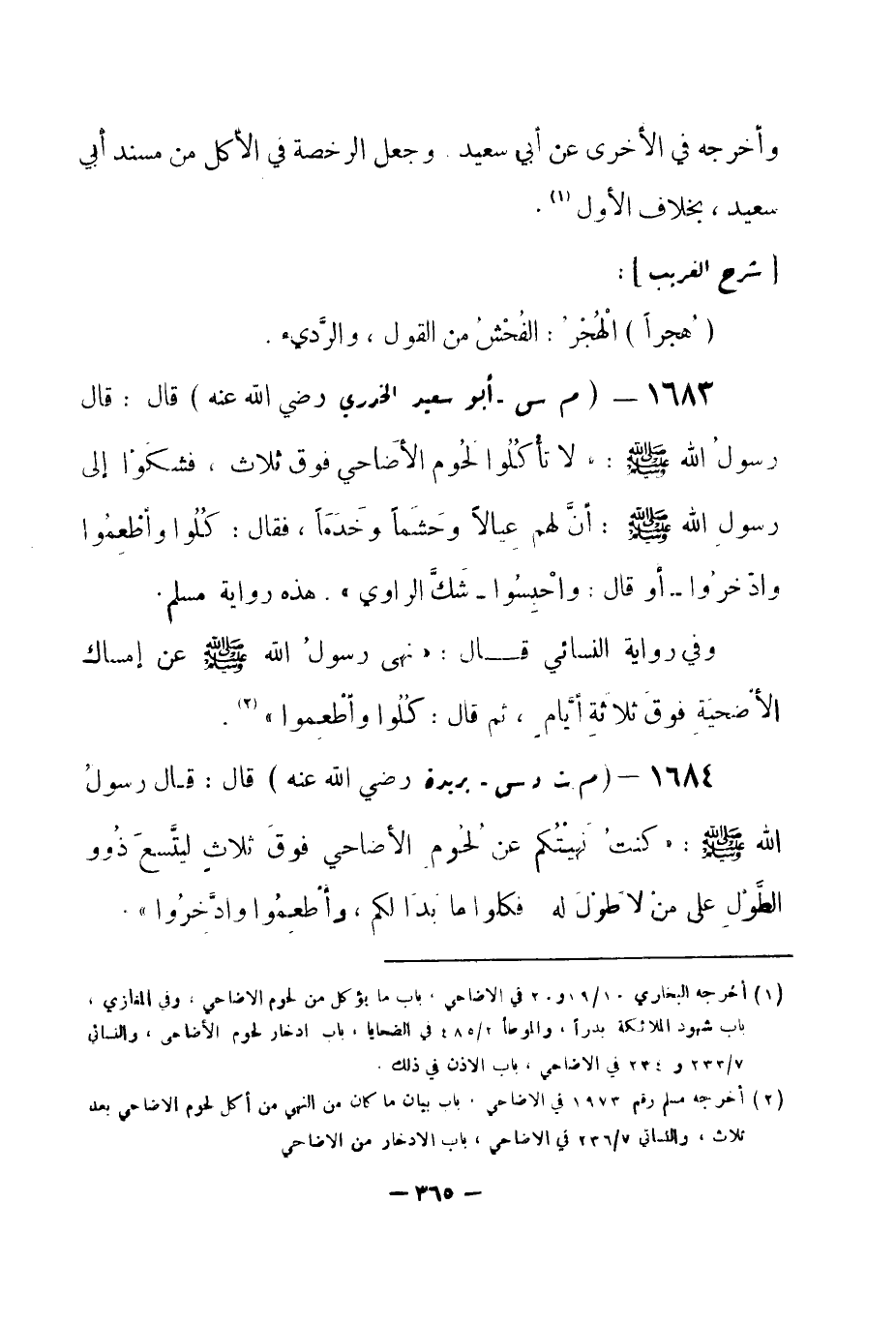 1683 - (م س) أبو سعيد الخدري - رضي الله عنه - قال: قال رسولُ الله -صلى الله عليه وسلم-: «لا تأْكُلُوا لحُوم الأضاحي فوق ثلاث، فشكوْا إلى رسول الله -صلى الله عليه وسلم-: أنَّ لهم عيالاً وحَشَماً وخَدَماً، فقال: كُلُوا وأطْعمُوا وادّخرُوا- أو قال: واحبسُوا - شَكَّ الراوي» . هذه رواية مسلم.