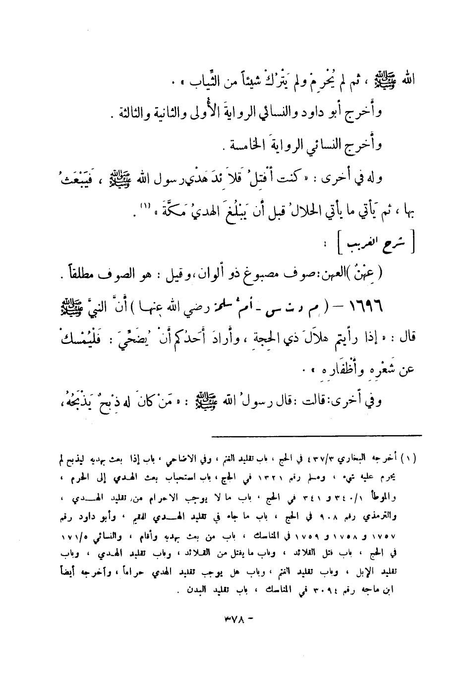 وفي أخرى: قالت: قال رسولُ الله -صلى الله عليه وسلم-: «مَنْ كانَ له ذِبحٌ يَذْبَحُهُ، -[379]- فإذا أهلَّ هِلالُ ذي الحجة فلا يأخذنَّ من شَعْرِه ولا مِنْ أظفاره شيئاً حتى يُضحي» (¬1) . أخرجه مسلم والترمذي وأبو داود والنسائي.
