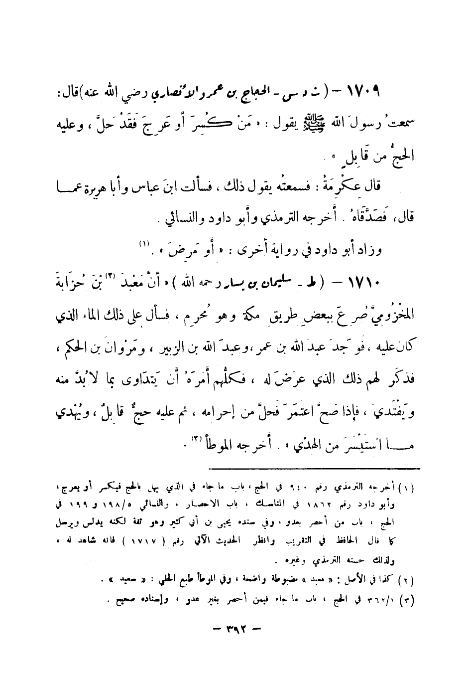 1709 - (ت د س) الحجاج بن عمرو الأنصاري - رضي الله عنه - قال: سمعتُ رسولَ الله -صلى الله عليه وسلم- يقول: «مَنْ كُسِرَ أو عَرِجَ فَقَدْ حَلَّ، وعليه الحجُّ من قَابِلٍ» .