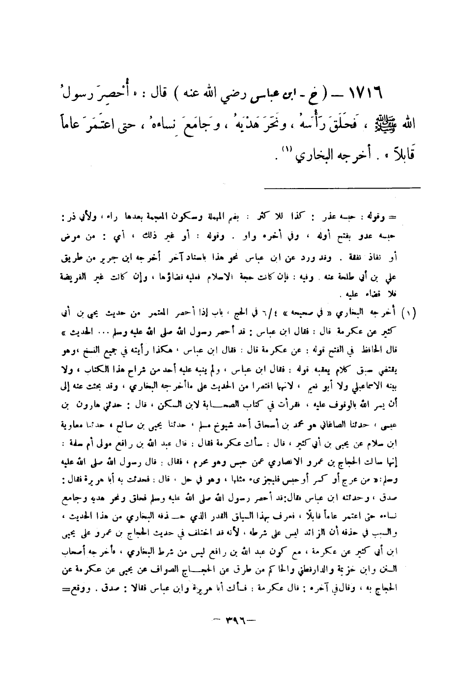 (¬1) أخرجه البخاري في " صحيحه " 4 / 6 في الحج، باب إذا أحصر المعتمر من حديث يحيى بن أبي كثير عن عكرمة قال: فقال ابن عباس: " قد أحصر رسول الله صلى الله عليه وسلم ... الحديث ". قال الحافظ في " الفتح ": عن عكرمة قال: فقال ابن عباس، هكذا رأيته في جميع النسخ، وهو يقتضي سبق كلام يعقبه قوله: فقال ابن عباس، ولم ينبه عليه أحد من شراح هذا الكتاب، ولا بينه الإسماعيلي ولا أبو نعيم؛ لأنهما اقتصرا من الحديث على ما أخرجه البخاري، وقد بحثت عنه إلى أن يسر الله بالوقوف عليه، فقرأت في كتاب الصحابة لابن السكن، قال: حدثني هارون بن عيسى، حدثنا الصاغاني هو محمد بن إسحاق أحد شيوخ مسلم، حدثنا يحيى بن صالح، حدثنا معاوية بن سلام عن يحيى بن أبي كثير، قال: سألت عكرمة فقال: قال عبد الله بن رافع مولى أم سلمة: إنها سألت الحجاج بن عمرو الأنصاري عمن حبس وهو محرم فقال: قال رسول الله صلى الله عليه وسلم: " من عرج أو كسر أو حبس فليجزئ مثلها، وهو في حل "، قال: فحدثت به أبا هريرة فقال: صدق، وحدثته ابن عباس فقال: قد أحصر رسول الله صلى الله عليه وسلم فحلق ونحر هديه وجامع نساءه حتى اعتمر عاماً قابلاً، فعرف بهذا السياق القدر الذي حذفه البخاري من هذا الحديث، والسبب في حذفه أن الزائد ليس على شرطه؛ لأنه قد اختلف في حديث الحجاج بن عمرو على يحيى بن أبي كثير عن عكرمة، مع كون عبد الله بن رافع ليس من شرط البخاري، فأخرجه أصحاب السنن وابن خزيمة والدارقطني والحاكم من طرق عن الحجاج الصواف عن يحيى عن عكرمة عن الحجاج به، وقال في آخره: قال عكرمة: فسألت أبا هريرة وابن عباس فقالا: صدق. ووقع -[397]- في رواية يحيى القطان وغيره في سياقه: سمعت الحجاج. وأخرجه أبو داود والترمذي من طريق معمر عن يحيى عن عكرمة عن عبد الله بن رافع عن الحجاج. قال الترمذي: وتابع معمراً على زيادة عبد الله بن رافع معاوية بن سلام، وسمعت محمداً (يعني البخاري) يقول: رواية معمر ومعاوية أصح. اهـ. فاقتصر البخاري على ما هو من شرط كتابه مع أن الذي حذفه ليس بعيداً من الصحة، فإنه إن كان عكرمة سمعه من الحجاج بن عمرو فذاك، وإلا فالواسطة بينهما وهو عبد الله بن رافع ثقة إن كان البخاري لم يخرج له.