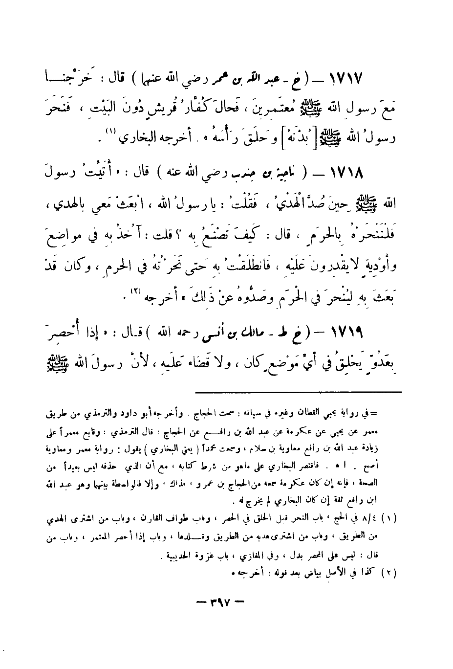 1717 - (خ) عبد الله بن عمر -رضي الله عنهما- قال: «خَرَجْنا مَعَ رسولِ الله-صلى الله عليه وسلم- مُعتَمرِينَ، فَحالَ كُفَّارُ قُريشٍ دُونَ البَيْتِ، فَنَحَرَ رسولُ الله -صلى الله عليه وسلم-[بُدْنَهُ] وحَلَقَ رأسهُ» . أخرجه البخاري (¬1) .