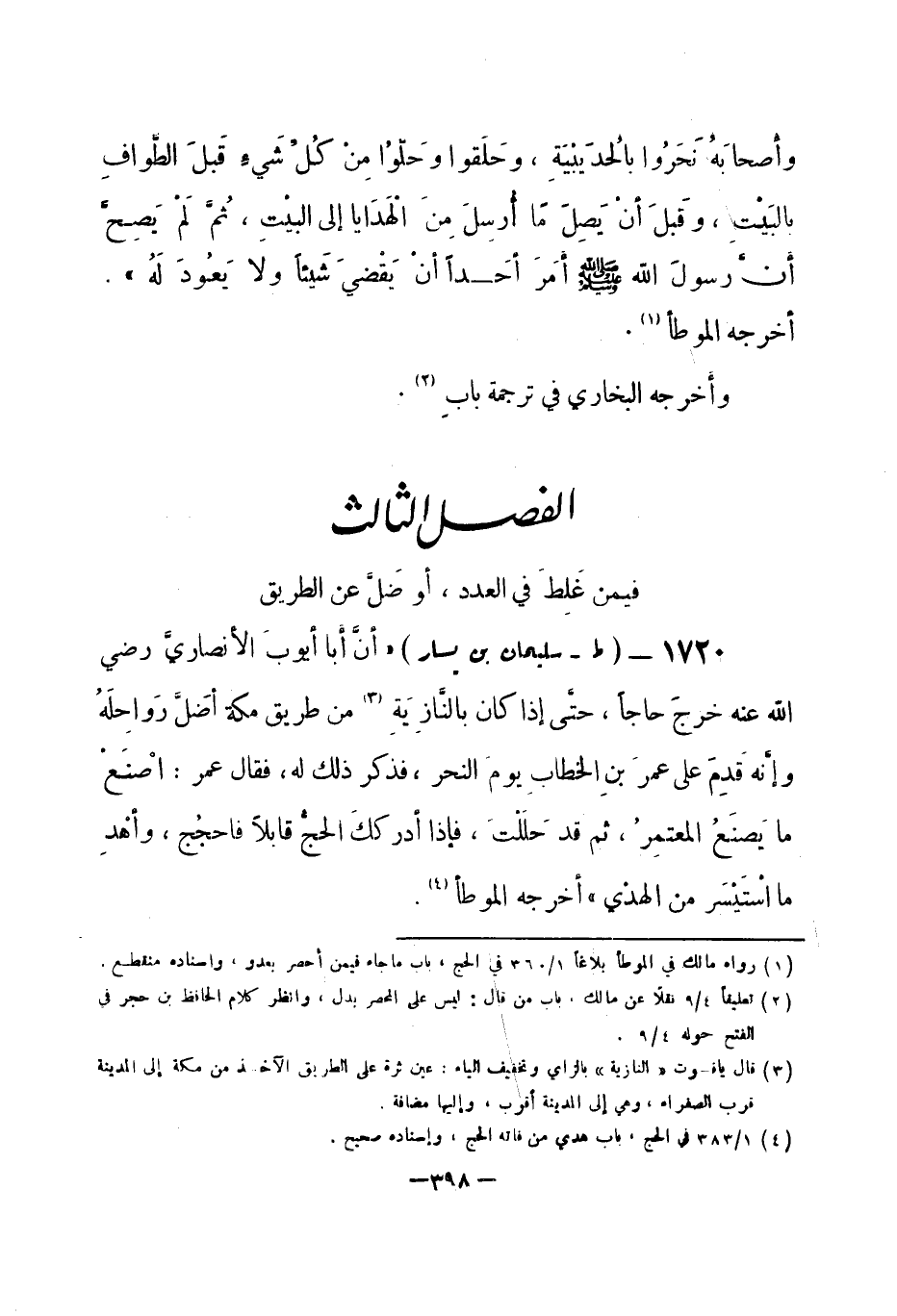 1720 - (ط) سليمان بن يسار «أنَّ أبا أيوبَ الأنصاريَّ -رضي الله عنه- خرجَ حاجاً، حتَّى إذا كان بالنَّازيَةِ (¬1) من طريق مكة أضَلَّ رَواحلَهُ،وإنّه قَدِمَ على عمرَ بنِ الخطاب يوم النحر، فذكر ذلك له، فقال عمر: اصنَعْ ما يَصنَعُ المعتمرُ، ثم قد حَلَلْتَ، فإذا أدرككَ الحجُّ قابلاً فاحجُج، وأهدِ ما اسْتَيْسر من الهدْي» . أخرجه الموطأ (¬2) .