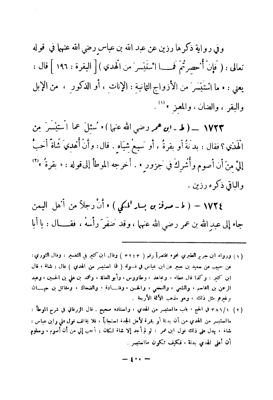 1723 - (ط) ابن عمر -رضي الله عنهما- «سُئِلَ عما اسْتيْسَرَ من الْهَدْي؟ فقال: بدنَةٌ أو بقرةٌ، أو سَبعُ شِيَاهٍ، قال: وأنْ أُهْدِيَ شَاة أحبُّ إليَّ مِنْ أن أصوم وأُشْرِكَ في جَزورٍ» . أخرجه الموطأ إلى قوله: «بقرةٌ» (¬1) والباقي ذكره رزين.