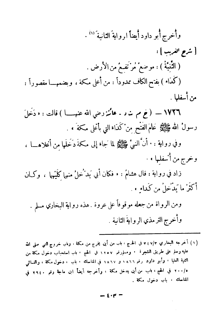 1726 - (خ م ت د) عائشة -رضي الله عنها- قالت: «دَخَلَ رسولُ الله -صلى الله عليه وسلم- عَامَ الفَتْحِ مِنْ كَدَاءَ التي بأعْلى مكةَ» .