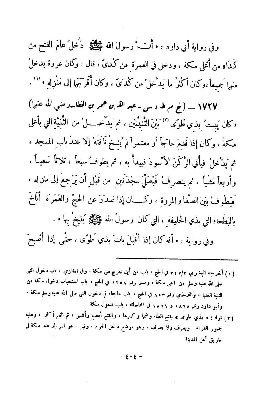 (¬3) أخرجه البخاري 3 / 346 و 347 في الحج، باب الاغتسال عند دخول مكة، وباب الإهلال مستقبل القبلة، وباب النزول بذي طوى قبل أن يدخل مكة، وباب من نزل بذي طوى إذا رجع من مكة، ومسلم رقم (1259) في الحج، باب استحباب المبيت بذي طوى عند إرادة دخول مكة، والموطأ 1 / 324 في الحج، باب غسل المحرم، وأبو داود رقم (1865) في المناسك، باب دخول مكة، والنسائي 5 / 199 في الحج، باب دخول مكة.