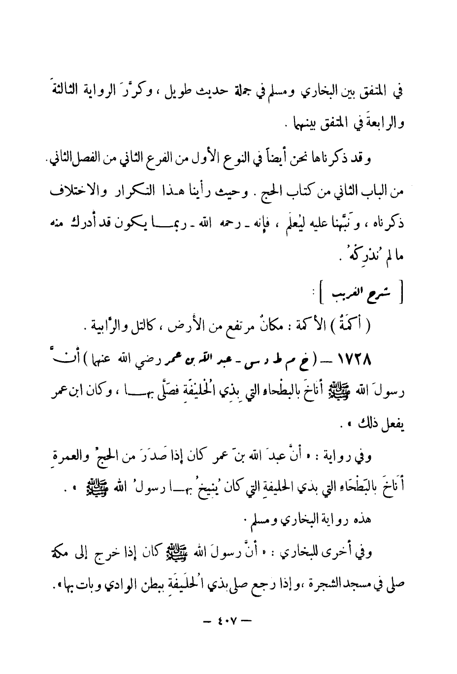 1728 - (خ م ط د س) عبد الله بن عمر -رضي الله عنهما- «أنَّ رسولَ الله -صلى الله عليه وسلم- أناخَ بالبطْحاءِ التي بِذِي الْحُليْفَةِ فصَلّى بها، وكان ابن عمر يفعل ذلك» .
