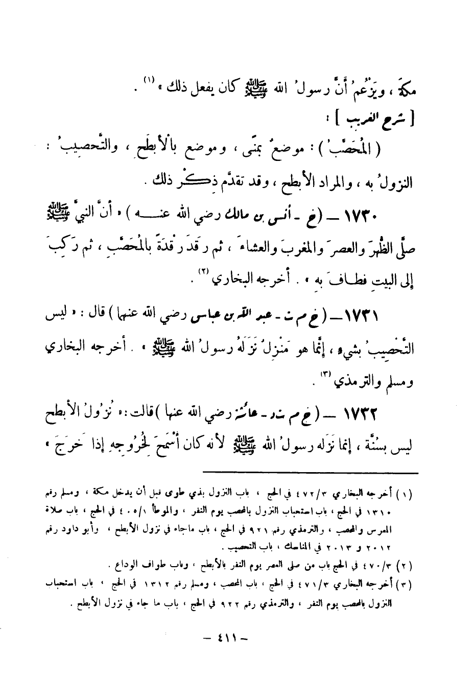 1731 - (خ م ت) عبد الله بن عباس -رضي الله عنهما- قال: «ليس التَّحْصِيبُ بشيءٍ، إنَّما هو مَنْزِلٌ نَزَلَهُ رسولُ الله -صلى الله عليه وسلم-» . أخرجه البخاري ومسلم والترمذي (¬1) .