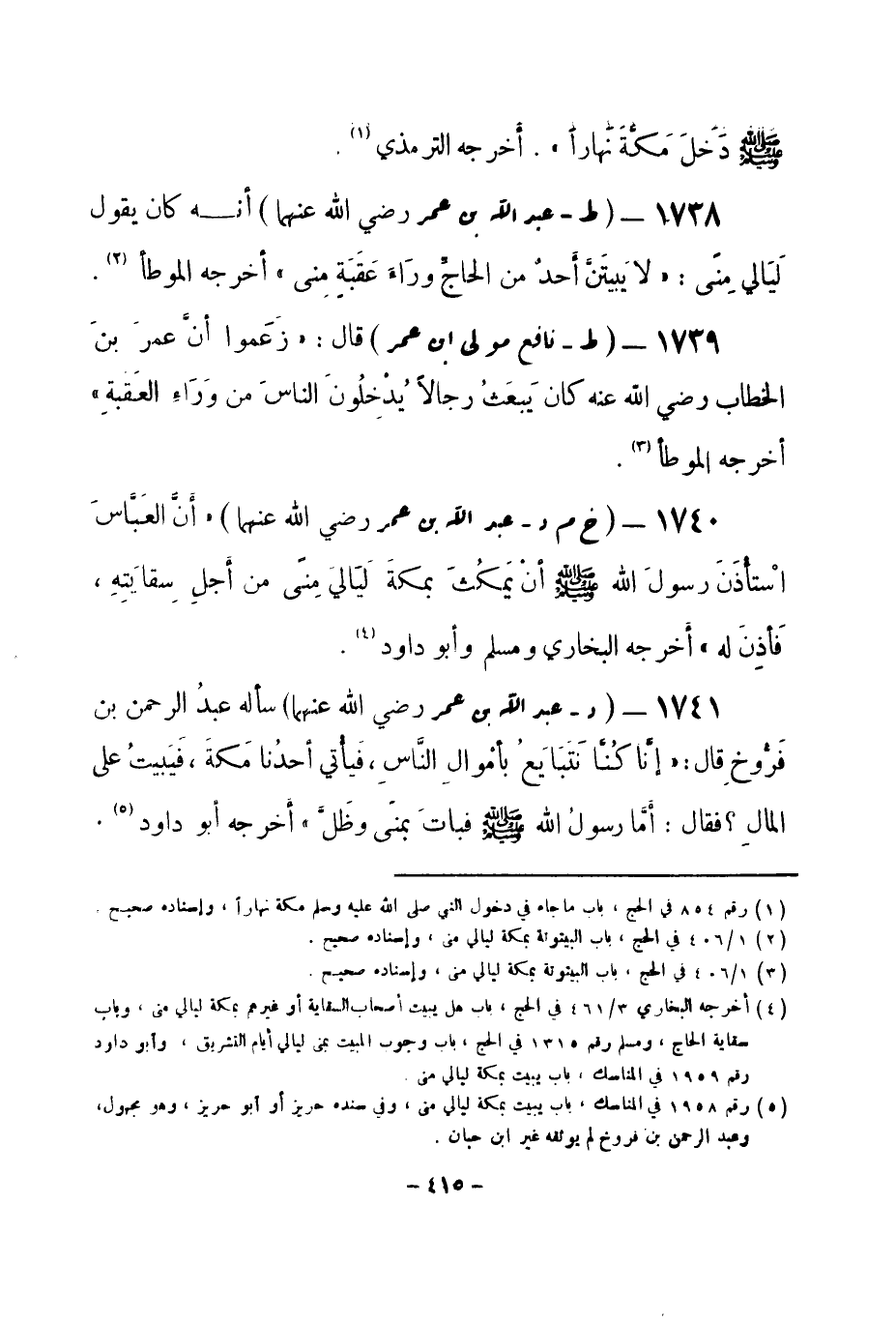 (¬1) رقم (1958) في المناسك، باب يبيت بمكة ليالي منى، وفي سنده حريز أو أبو حريز، وهو مجهول، وعبد الرحمن بن فروخ لم يوثقه غير ابن حبان.