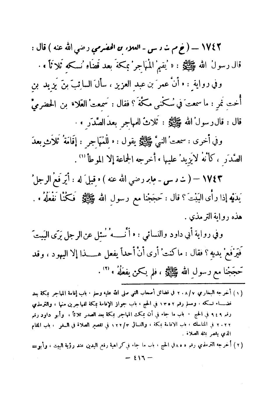 1742 - (خ م ت د س) العلاء بن الحضرمي - رضي الله عنه - قال: قال رسولُ الله -صلى الله عليه وسلم-: «يُقيمُ المُهَاجِرُ بمكةَ بعد قَضَاءِ نُسكهِ ثَلاثاً» .