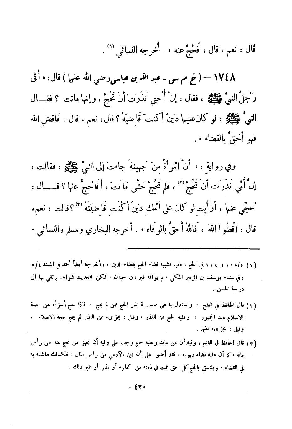 1748 - (خ م س) عبد الله بن عباس -رضي الله عنهما- قال: «أتى رَجُلٌ النبيَّ - صلى الله عليه وسلم -، فقال: إنَّ أُختي نَذَرَتْ أَنْ تَحُجَّ، وإنها ماتت؟ فقال النبي -صلى الله عليه وسلم-: لو كان عليها دَينٌ أكنتَ قَاضِيَهُ؟ قال: نعم، قال: فَاقضِ الله فهو أحَقُّ بالقضاء» .