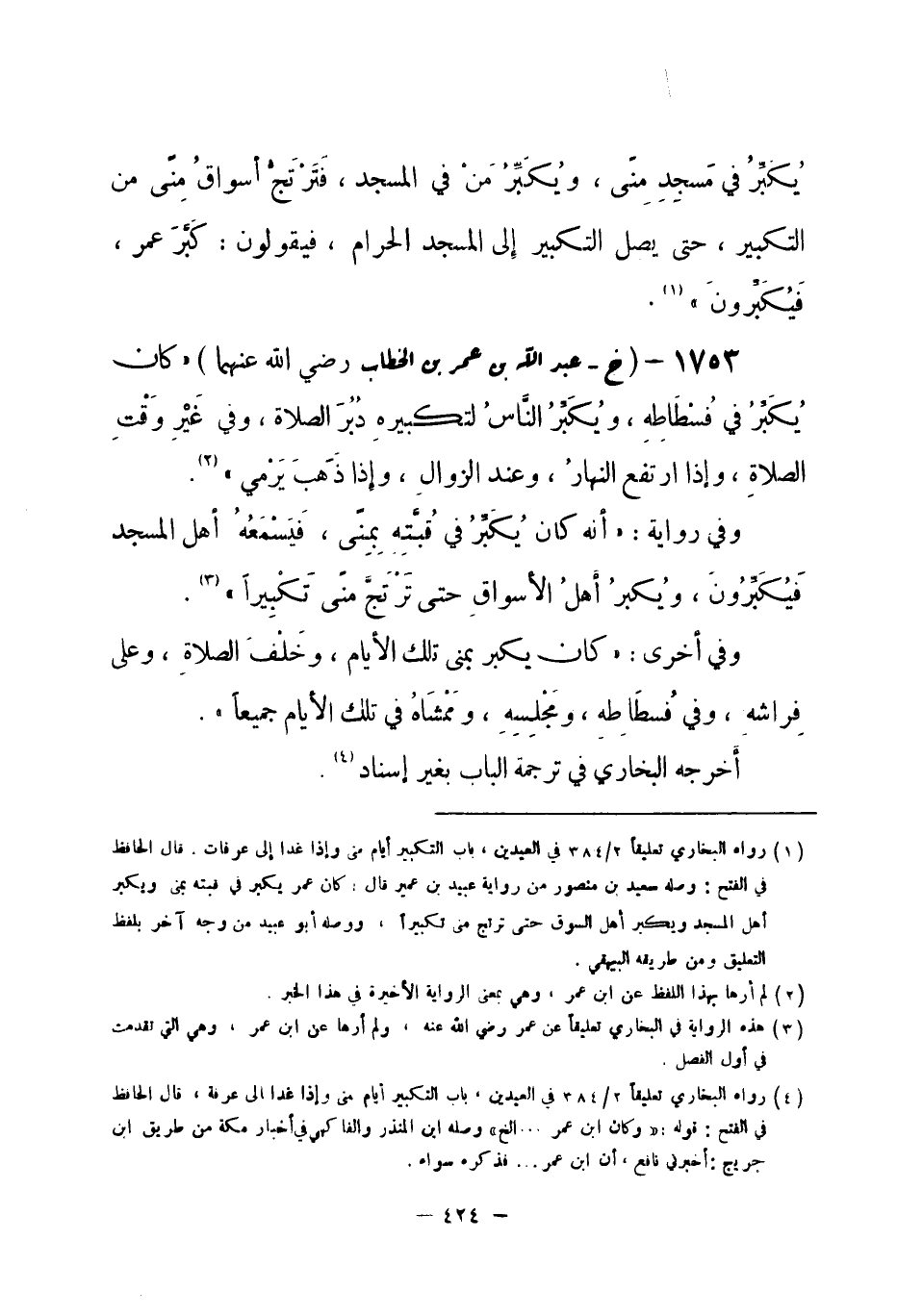 1753 - (خ) عبد الله بن عمر بن الخطاب -رضي الله عنهما- «كان يُكَبِّرُ في فُسْطَاطِهِ، ويُكَبِّرُ النَّاسُ لتكبيرهِ دُبُرَ الصلاة، وفي غَيْرِ وَقْتِ الصلاةِ، وإذا ارتفع النهارُ، وعند الزوال، وإذا ذَهبَ يَرْمي» (¬1) .