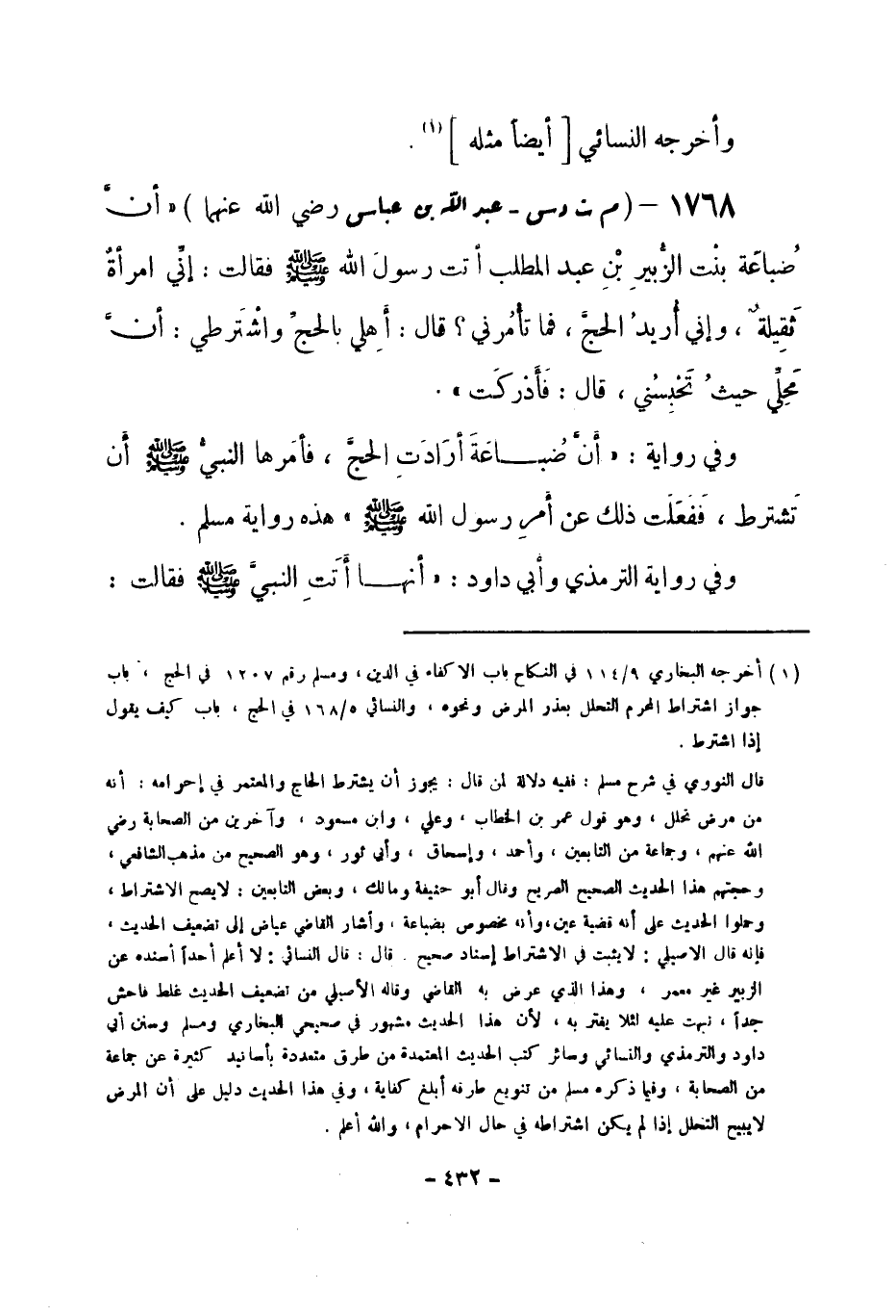 1768 - (م ت د س) عبد الله بن عباس -رضي الله عنهما- «أنَّ ضُباعَة بنْت الزُّبيرِ بْنِ عبد المطلب أتت رسولَ الله -صلى الله عليه وسلم- فقالت: إنّي امرأةٌ ثَقِيلةٌ، وإني أُريدُ الحجَّ، فما تأمُرني؟ قال: أَهِلي بالحجِّ واشْتَرطي: أنَّ مَحِلِّي حيثُ تَحْبِسُني، قال: فَأَدْركَت» .