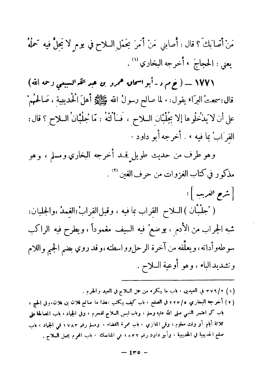 1771 - (خ م د) أبو إسحاق عمرو بن عبد الله السبيعي -رحمه الله- قال: سمعتُ البرَاءَ يقول: «لما صالح رسولُ الله -صلى الله عليه وسلم- أهلَ الحُديبيةِ، صَالحُهمْ على أن لا يَدْخُلُوها إلا بجُلُبَّانِ السلاحِ، فَسَأْلتُهُ: مَا جُلُبَّانُ السلاح؟ قال: القِرابُ بما فيه» . أخرجه أبو داود.